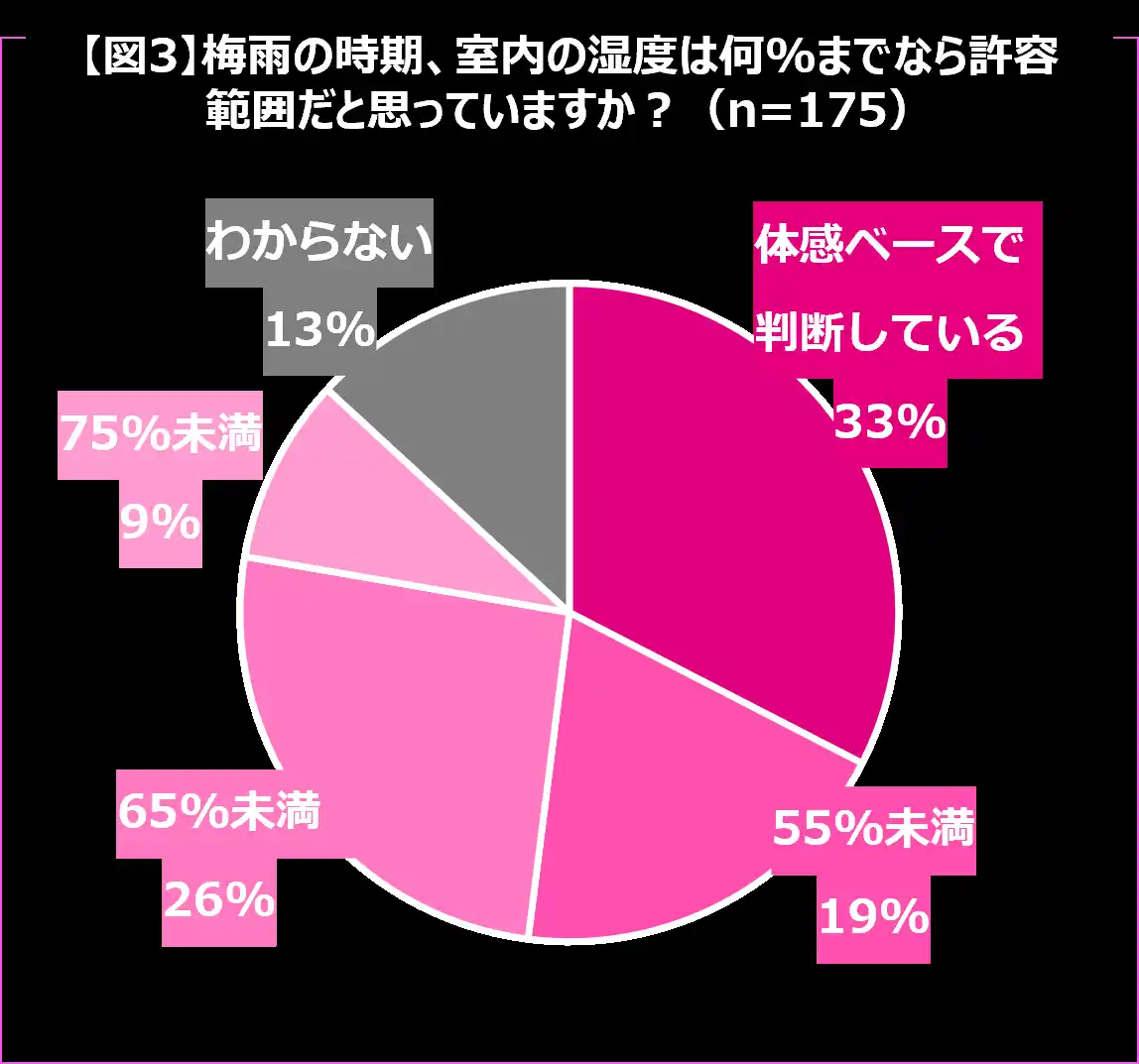 梅雨時期の室内湿度について「どこまでなら許容できるか」を尋ねたところ、「湿度55%」というダニが発生しづらい湿度でキープできている人は僅か19%。さらに、約3人に1人が「体感ベースで判断している」と回答しました。【図3】 |