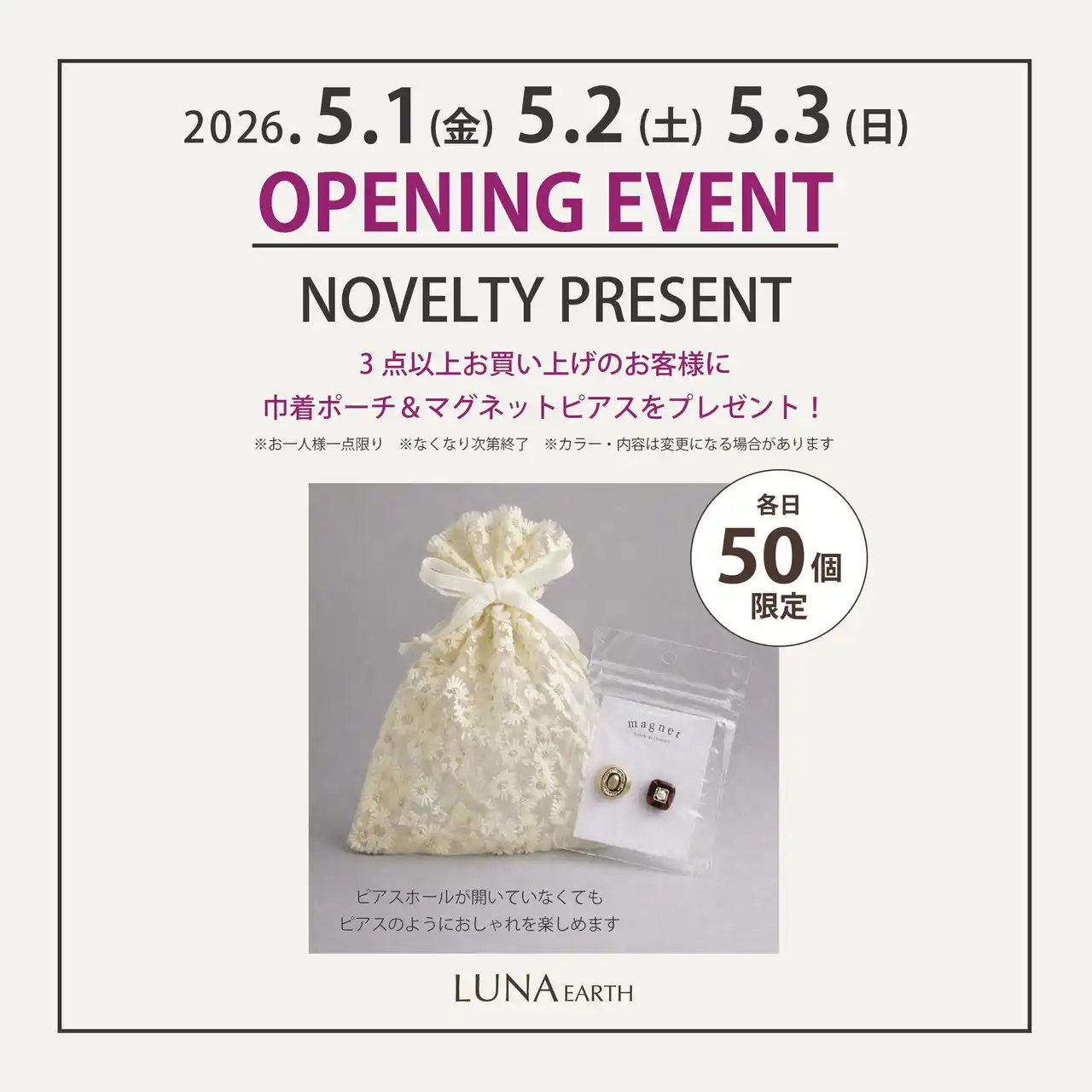 | 商品を3点以上お買い上げのお客様に、巾着ポーチ&マグネットピアスのセットをプレゼントいたします。 | |||