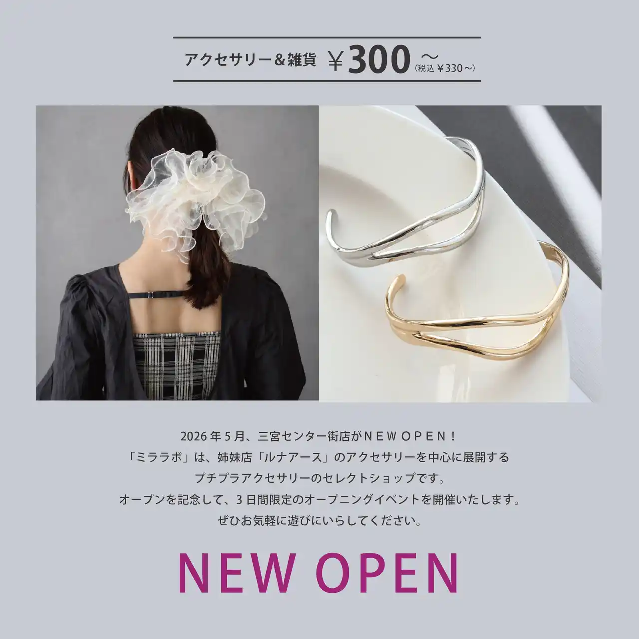 | ビーズやアクセサリーパーツなどの企画・製造・販売をする株式会社エンドレス(本社:東京都台東区、代表取締役:蕭(しょう)易風(えきふう)の運営するプチプラアクセサリーショップ「LUNA EARTH(ルナアース) https://lunaearth.jp/ 」の姉妹ブランド「Mira LABO」がこの度、三宮センター街に5/1(金)オープン。 | |||