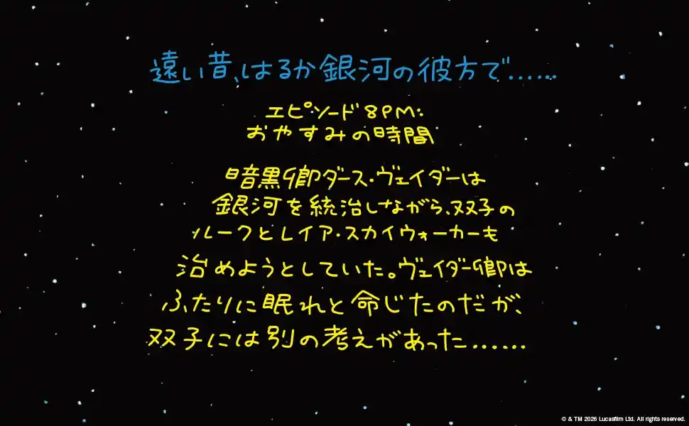 | 果たしてパパ ヴェイダーは、ルークとレイアを寝かしつけることができるのか。 | ||||||||||||||||||||||||