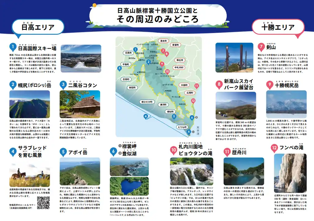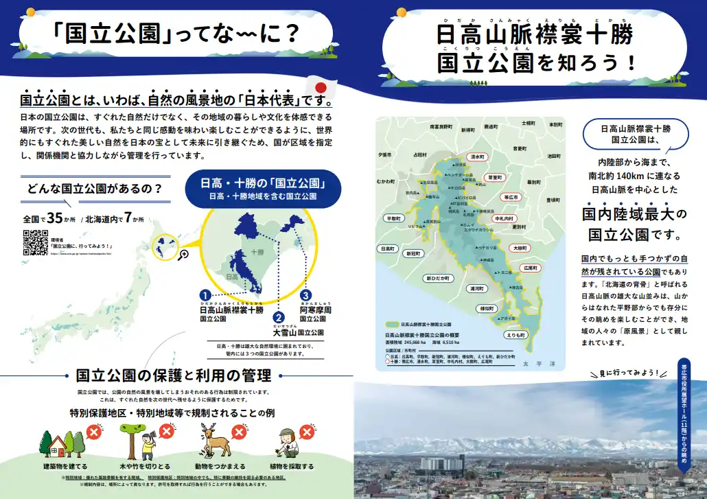| 十勝総合振興局、日高振興局及び日高山脈襟裳十勝国立公園・十勝環境保全委員会は、令和6年6月に指定された日高山脈襟裳十勝国立公園の理解促進を目的としたパンフレット「日高山脈襟裳十勝国立公園を知ろう」を作成しました! | |||||||||