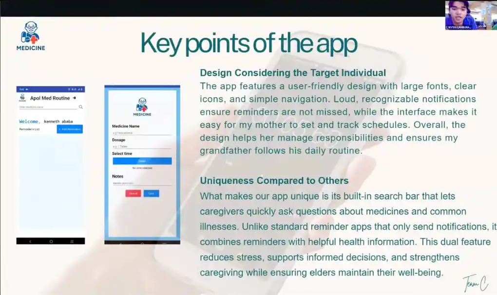 「祖父の薬管理に苦労する母を助けたい」という想いから開発。データベースとアラーム機能を活用し、服薬時間を記録・通知することで、家族間のケアの負担をテクノロジーで軽減します。 |