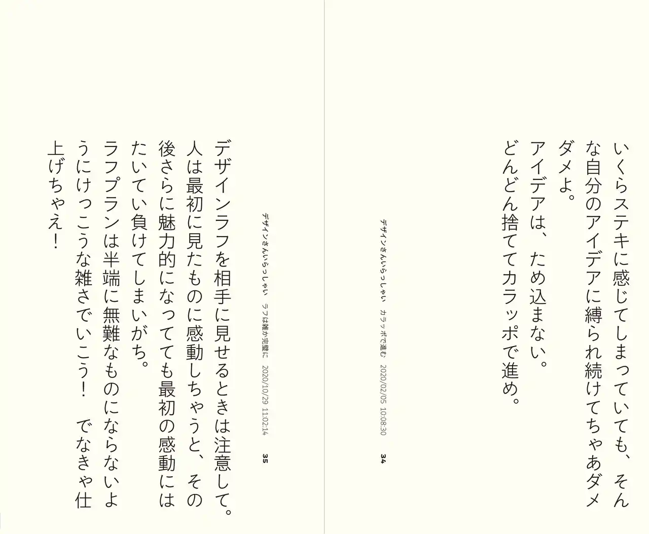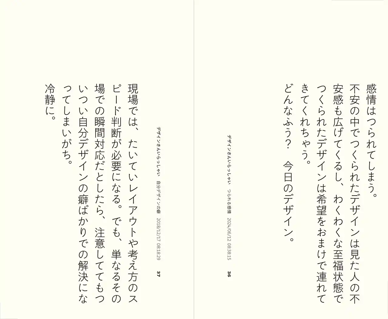 デザインさんいらっしゃい/イメージと言葉/レイアウトはなっちゃった感/書体と仲良し/文字組みはいつだって新鮮に/色と色校正、関わりと味わい/紙はちょっとややこしい/デザインさんよしなしごと |