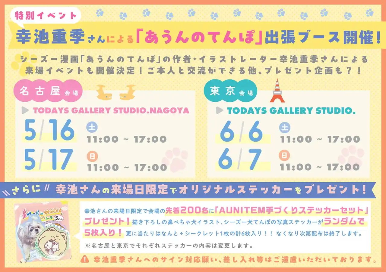 シーズー漫画「あうんのてんぽ」の作者・イラストレーター幸池重季による来場イベントを開催!作品の世界観を間近で楽しめるほか、ここでしか手に入らない限定グッズも登場します。 |