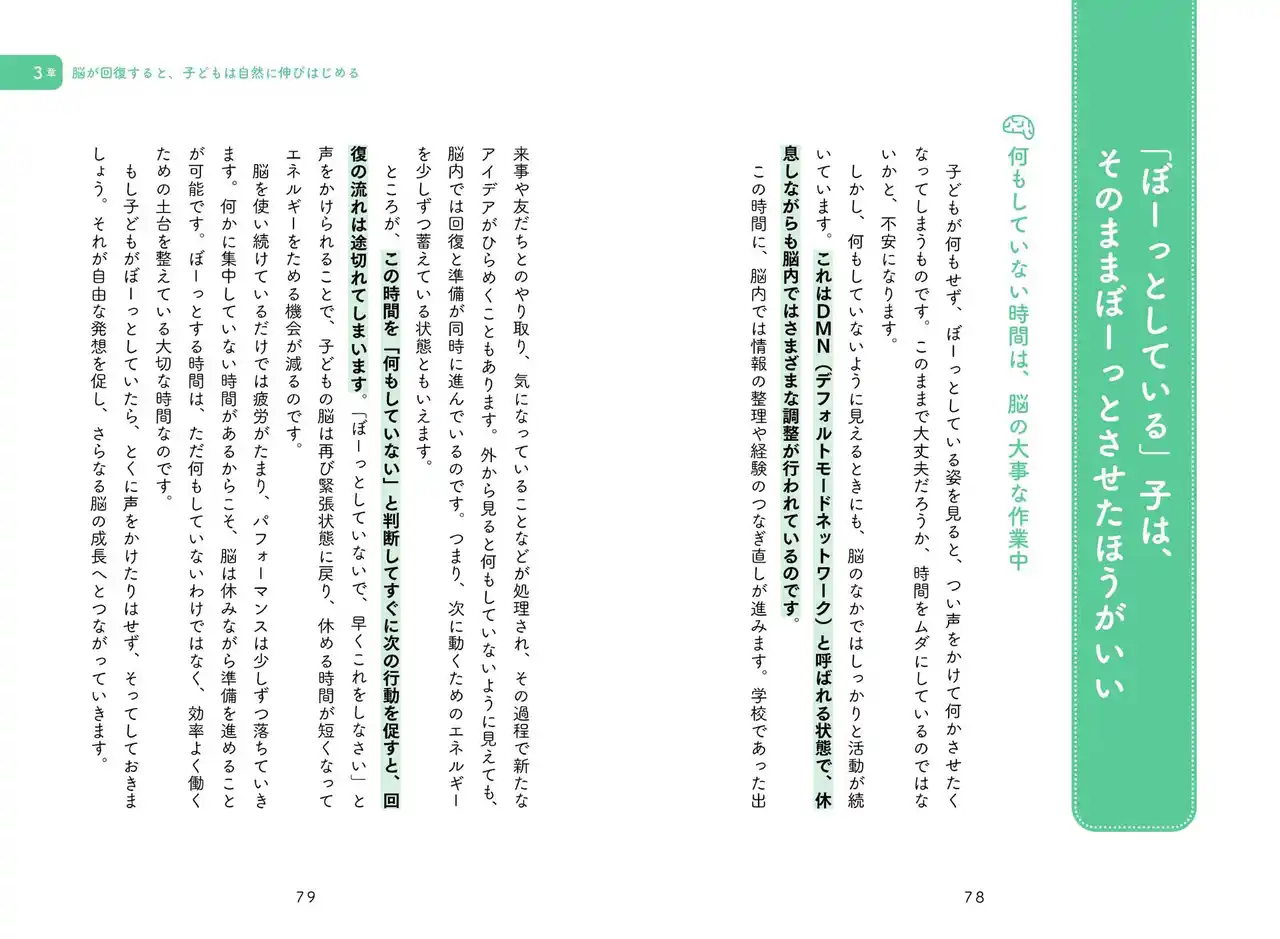 | さらに、家庭でできる環境の整え方や、子どもが本来持っている回復力を引き出すための関わり方を紹介。無理にがんばらせるのではなく、脳を休ませることで、子どもは自分から動き出す。そのためのヒントが詰まった一冊です。 | |||||||||