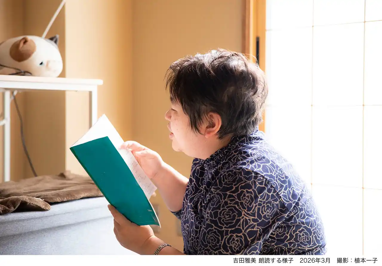 1982年、東京都生まれ。社会福祉法人しらかばの会 たてしなホーム(長野県北佐久郡立科町)で工芸班に所属。工芸班の活動の時間には、好きな文章の朗読を行う。また、日記を書くのが幼少期からの習慣という吉田は、食事や作業の後、自身の行動をノートに記録する。日記には、その日にあったことや食べたものについて記されており、吉田の日常が浮かびあがってくるものである。 |