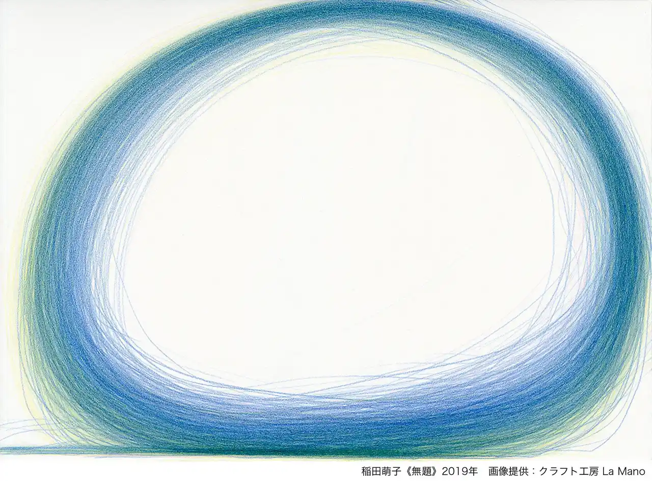 1985年、京都府生まれ。2003年より、クラフト工房 La Mano(東京都町田市)に所属。色鉛筆のこすれる音や感触を楽しむように、時に童謡を口ずさみながら、ゆったりとしたリズムに身を任せるようにして円や線を描く。その時々の好きな動きをもとにした、稲田の感覚的な心地よさによって生まれる作品は、まるで繭のような柔らかさと光をたたえている。 |