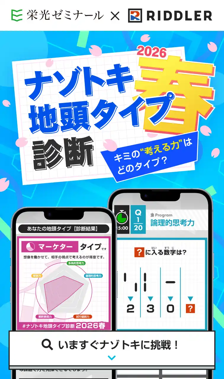 株式会社増進会ホールディングス(Z会グループ)のグループ会社、株式会社栄光(本社:東京都千代田区 代表取締役社長:下田勝昭)が運営する進学塾「栄光ゼミナール」は、謎解きクリエイター松丸亮吾氏率いるRIDDLER(リドラ)株式会社(本社:東京都豊島区 代表取締役:松丸亮吾)とコラボし、スマートフォンで誰でも無料で楽しめる「ナゾトキ地頭タイプ診断 2026春」を、2026年4月27日(月)より公開します。