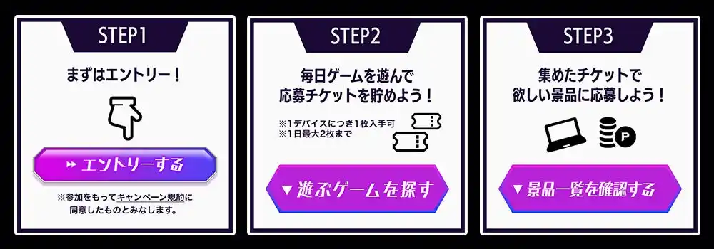 | キャンペーンにエントリー後、対象デバイス(PCブラウザ、スマホブラウザ、GAMES STORE版Androidアプリ、PCダウンロード版)でDMM GAMESで配信中のゲームをプレイすると各デバイス1日1回応募チケットを獲得できます。 | |||