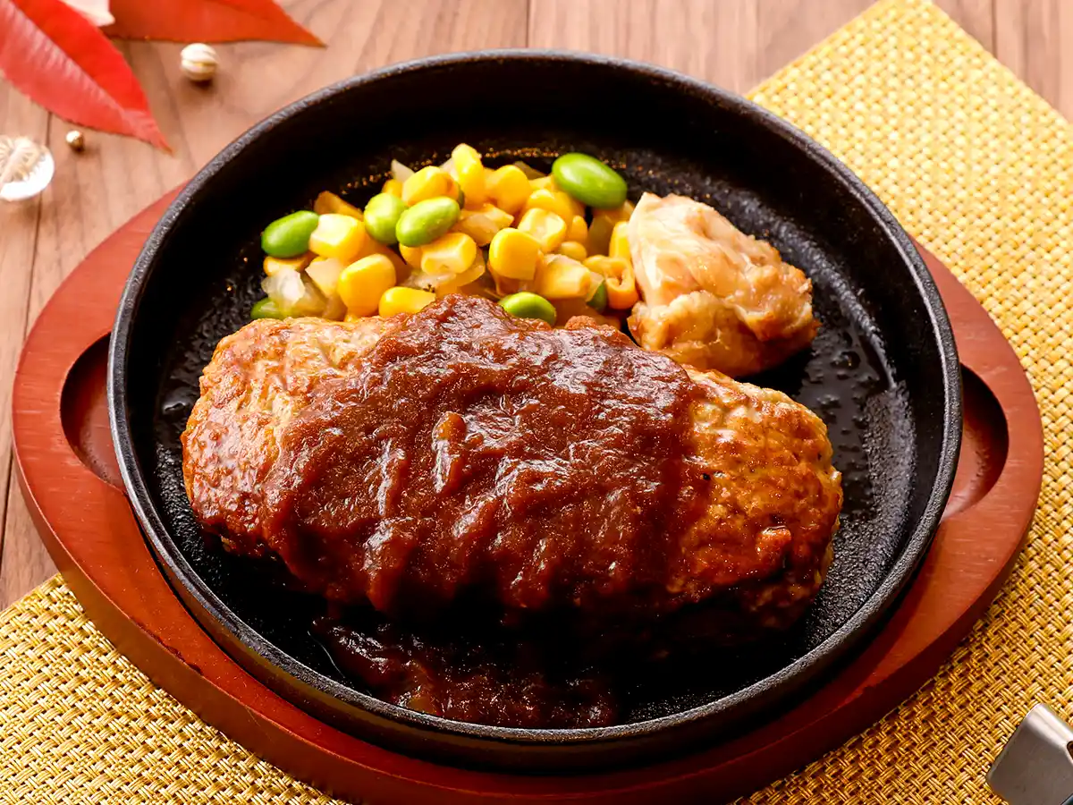 今回新登場する「濃厚デミソースのBIGハンバーグ」は、170gの肉厚ハンバーグとグリルチキンを盛り合わせた、ボリューム満点の一皿です。洋風だしで野菜の旨みを重ねた特製デミグラスソースをたっぷりとかけ、粗挽きブラックペッパーでプレート全体の味を引き締めました。また、彩り野菜の枝豆、スイートコーン、玉ねぎが食感と甘みのアクセントとなっています。肉の旨みを存分に楽しめる、食べ応え抜群の満腹メニューです。 |