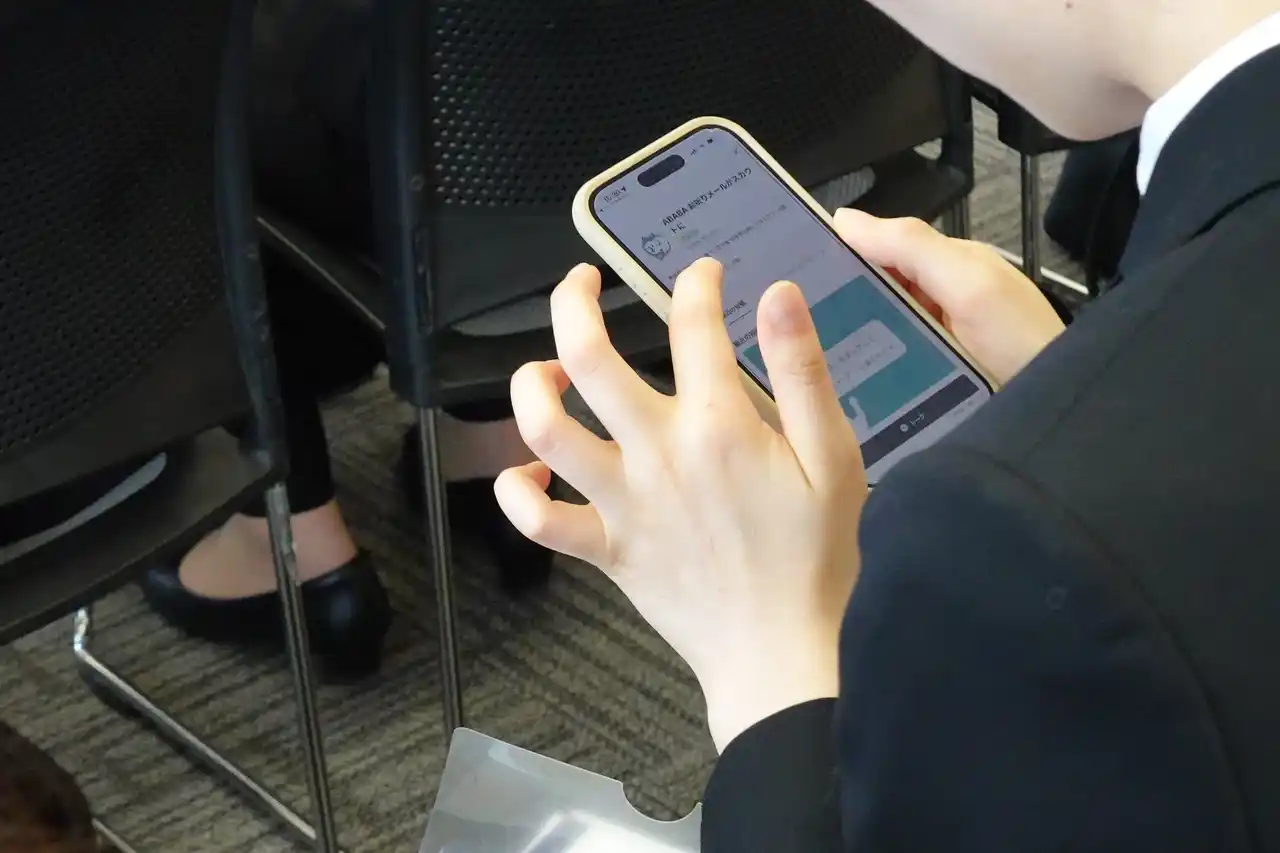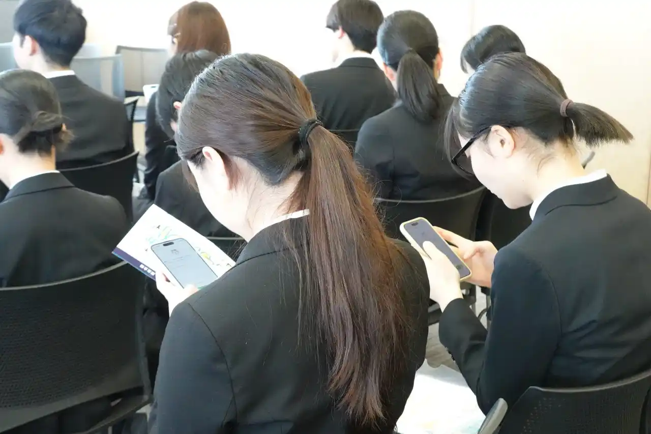 自身のスマートフォンで『ABABA』の登録に取り組む学生たち |