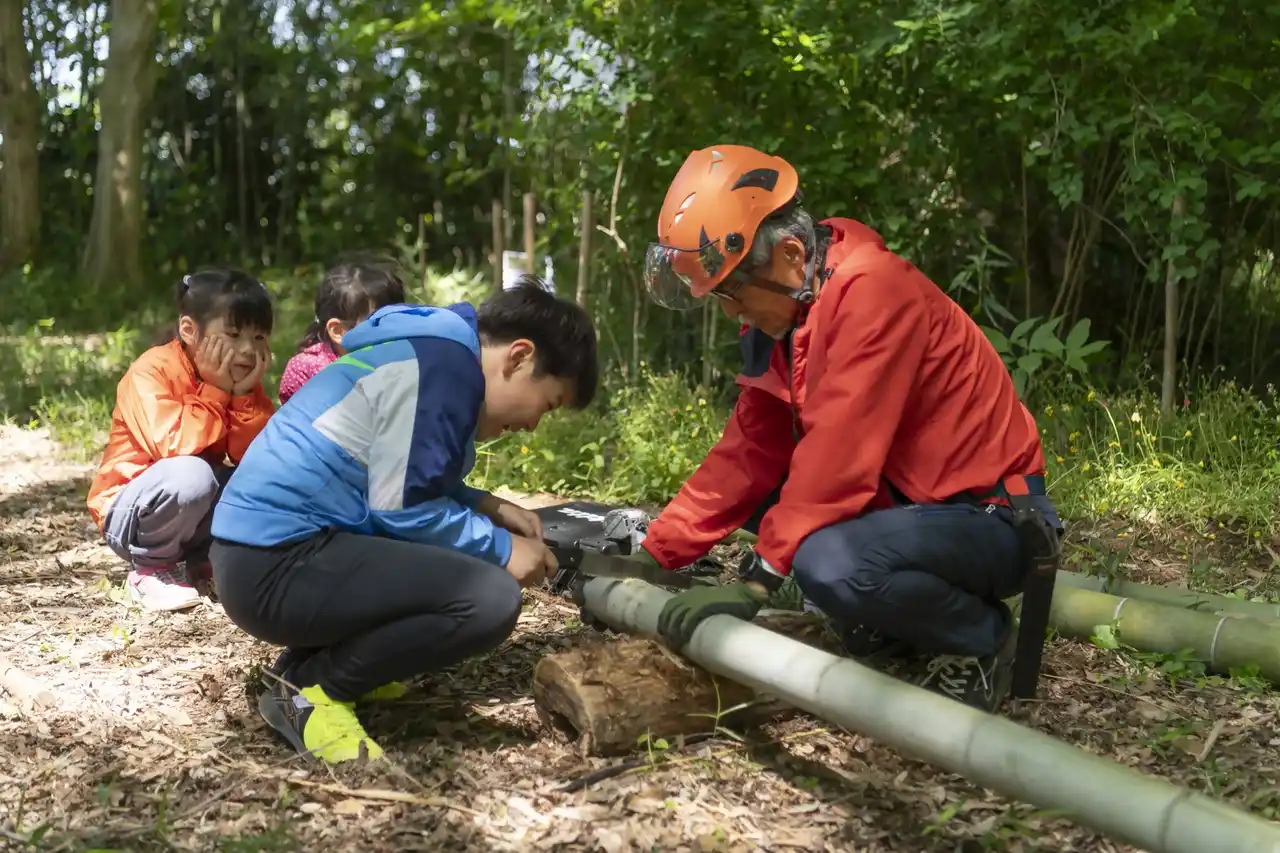 森では、里やまボランティアが森の説明や案内をします。また、ハンモックやブランコ、のこぎりを使った工作など、子どもたちが楽しく遊べる工夫をして皆さんをお待ちしています。 |