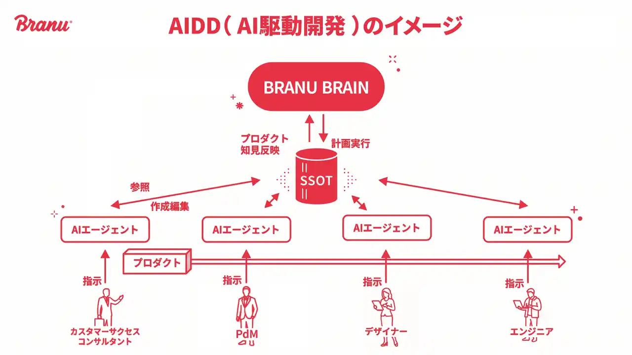 本取り組みは、「何を作るか」を導き出すAI基盤「BRANU BRAIN」と、「どのように作るか」を定義するSSOT(Single Source of Truth)の2つの要素によって構成されています。 「BRANU BRAIN」 意思決定の上流には、当社のAI基盤「BRANU BRAIN」があります。 「BRANU BRAIN」には、6,200社以上の建設中小事業者の顧客データや市場環境、過去の意思決定とその結果が蓄積されており、「何を作るべきか」という判断を、経験や勘ではなく、データに基づいて行うことが可能となります。 SSOT SSOTは、プロダクトに関するすべての判断基準を一元化し、「唯一の正解データ」として管理する仕組みです。 「BRANU BRAIN」が「何を作るか」を導き出すのに対し、SSOTはプロダクトの方針や機能仕様、UI/UXルール、設計制約などを統合し、「どのように作るか」を一貫した基準で定義します。 SSOTにより、開発に関わるすべてのメンバーとAIが同じ基準で判断できる状態が整い、従来必要とされてきた要件のすり合わせや認識の調整といった工程そのものが不要になり、コミュニケーションコストの削減につながります。 この構造により、要件定義から仕様化までが分断なく進むようになり、手戻りや調整工数といった工程自体が発生しにくくなることから、開発生産性は1.3倍~2倍(当社試算)向上する見込みです。 |