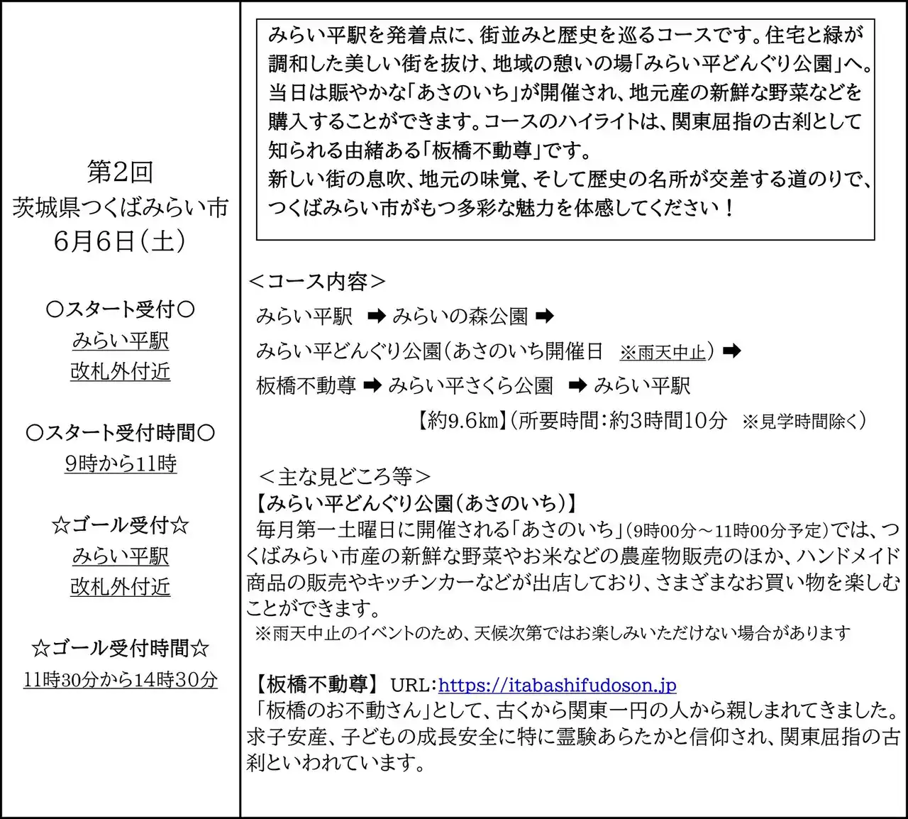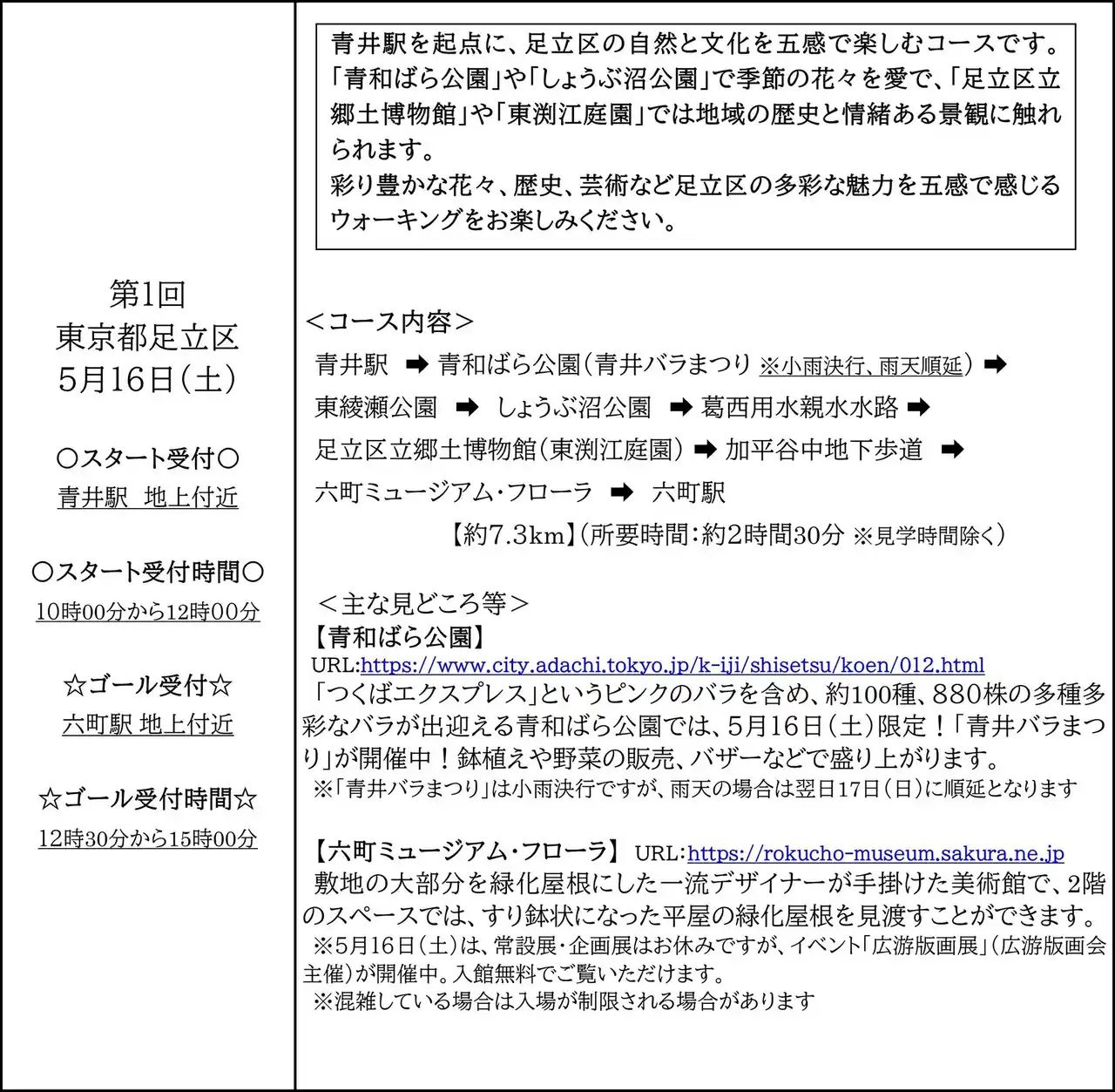 本年度の第1回イベントは、足立区の協力のもと、2026年5月16日(土)に、『五感で楽しむ「あだち彩り」花散歩』と題し、青井駅から六町駅を巡るコースをご用意しました。また、第2回イベントとして、つくばみらい市の協力のもと、2026年6月6日(土)に、『~つくばみらい市市制施行20周年記念~みらい平を周遊!緑の街並みと板橋不動尊を訪ねる』と題し、みらい平駅周辺を巡るコースをご用意しました。 |