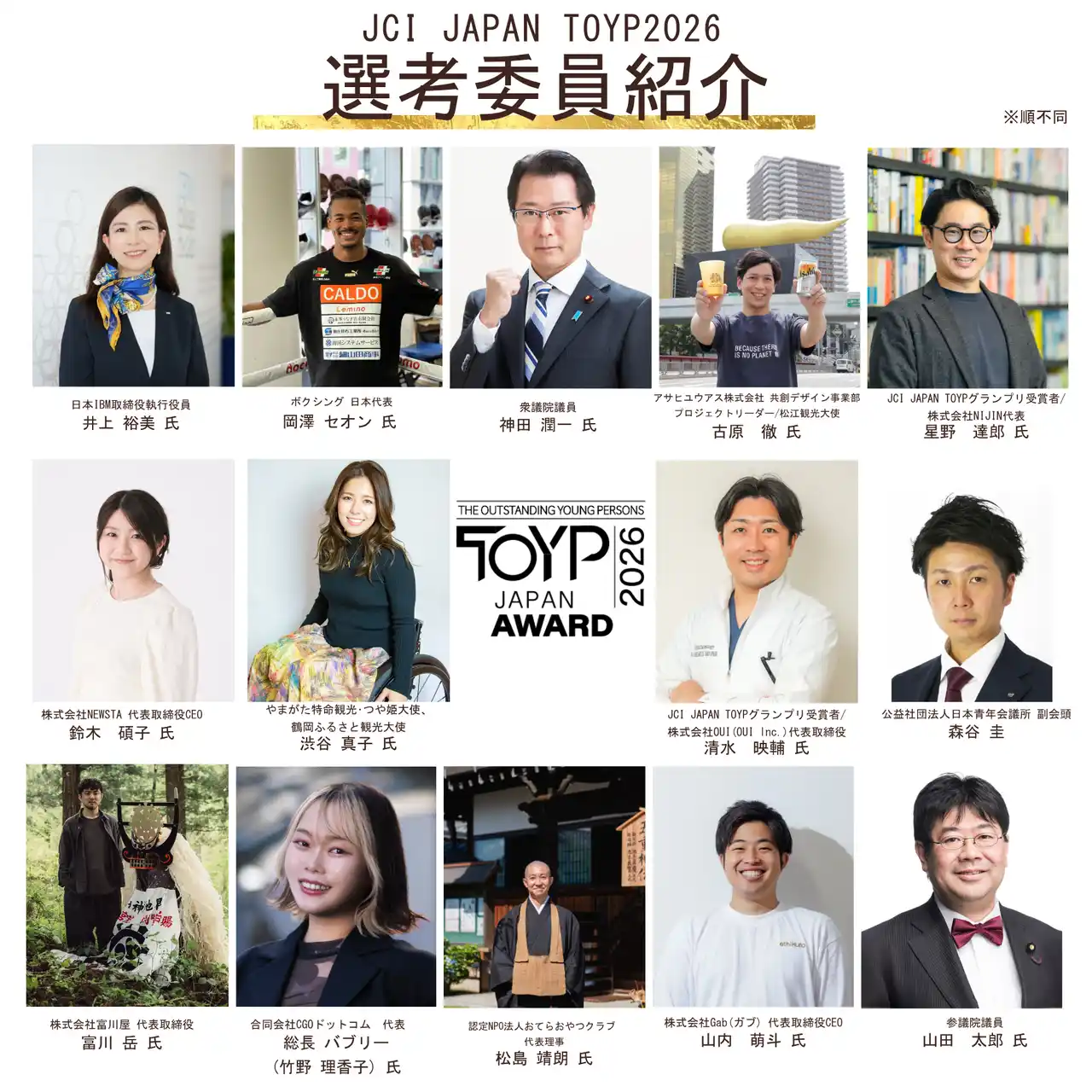 | 公益社団法人日本青年会議所(会頭:加藤大将、所在地:東京都千代田区麹町2-12-1VORT半蔵門7F、以下「日本JC」)が主催する「JCI JAPAN TOYP 2026」(第40回青年版国民栄誉賞)の最終選考委員14名が決定しましたのでお知らせいたします。 | |||