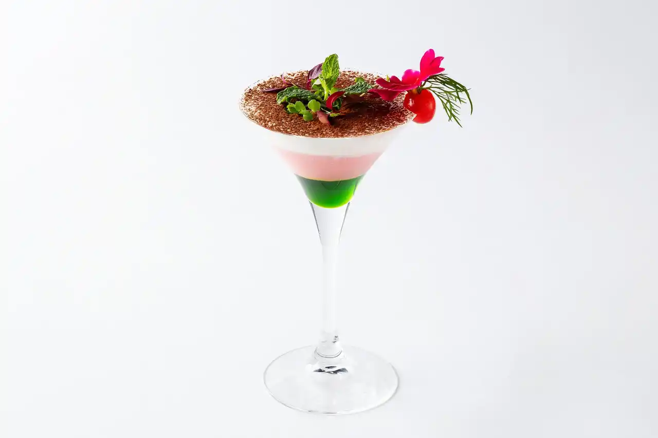 抹茶の緑、苺の赤、クリームの白の三層は、芽吹き・葛藤と成長・そして現在を表しています。15年の月日が積み重なり、やがて豊かな土壌となる。その大地から、新たな芽吹きが生まれることを表現したデザートカクテルです。 |