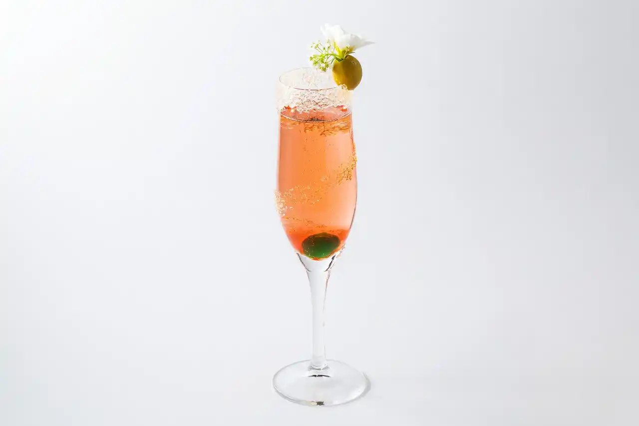 日本酒にメロンリキュールを合わせ、グレープフルーツジュースでほどよい苦みを感じつつ、甘くさっぱりした味わいをお楽しみいただける一杯。コースデザート「翡翠の祝杯 ~メロンと吟醸酒のヴェリーヌ~」と並べると、その美しく鮮やかな緑がテーブルを明るく彩ります。 |