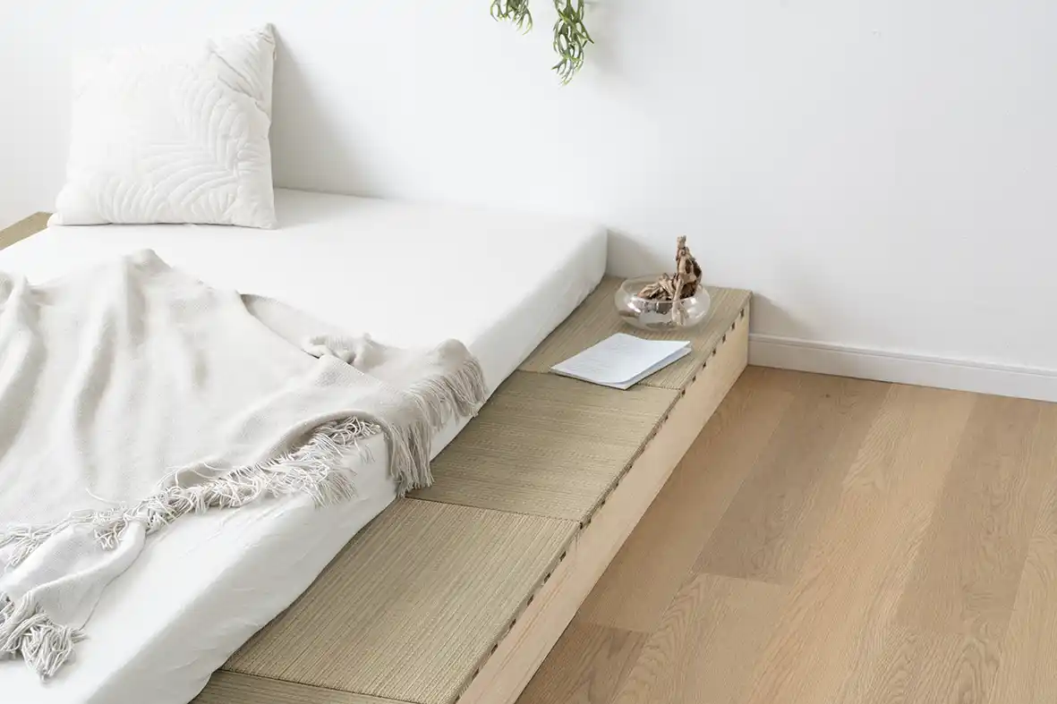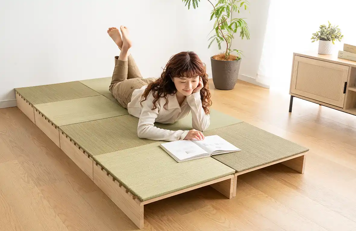 | 【タンスのゲン】パレットベッドの市場を開拓・普及を進めるタンスのゲンから新たな可能性を提案。天然い草の香りに包まれる和空間を自在にカスタマイズ。布団スタイルや小上がりとしても活躍。 |