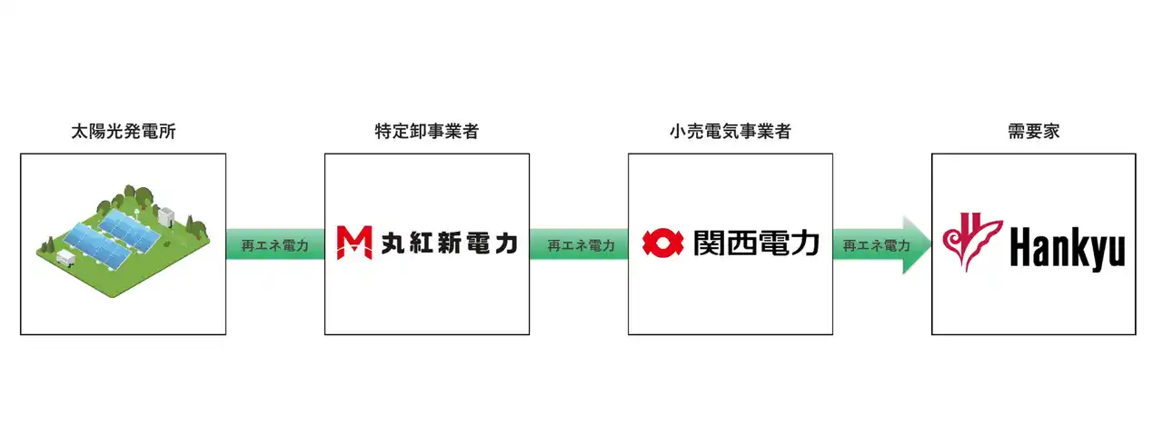 丸紅株式会社の連結子会社である丸紅新電力株式会社(以下「丸紅新電力」)と、関西電力株式会社(以下、関西電力」)は、阪急電鉄株式会社(以下、阪急電鉄)への太陽光発電所を活用した「オフサイトコーポレートPPA」(※)(以下「本契約」)の契約に合意しました。この取り組みは、複数の太陽光発電所で発電された約5,000kWの再エネ電力を丸紅新電力が特定卸事業者(アグリゲーター)としてとりまとめ、関西電力がオフサイトコーポレートPPAにて阪急電鉄へ供給するものです。 |