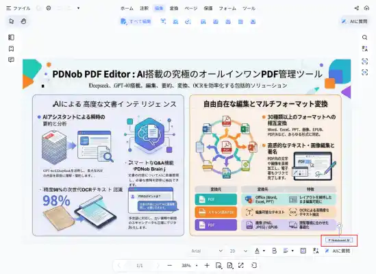 NotebookLMのスライドをPDFとして扱い、テキスト・画像・レイアウト・透かし要素まで直接編集できます。AIでの再生成に頼らず、その場で修正できるのが大きな特徴です。