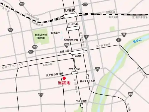 | 本計画地は、札幌有数の繁華街である「すすきの」エリアの中心に位置しています。札幌市営地下鉄南北線「すすきの」駅および札幌市営地下鉄東豊線「豊水すすきの」駅から徒歩圏内と高い交通利便性を有し、観光・ビジネスの双方において優れたアクセス環境を備えています。周辺には飲食店や商業施設、エンターテインメント施設が集積しており、国内外の観光客を惹きつける高い集客力を有するエリアです。また、札幌駅周辺や大通エリアへの回遊性にも優れており、観光拠点としての利便性に加えてビジネス拠点へのアクセス性も高いことから、レジャー・ビジネス双方の国内外ニーズに対応できる魅力的なホテル立地です。 | ||||||||||||||||