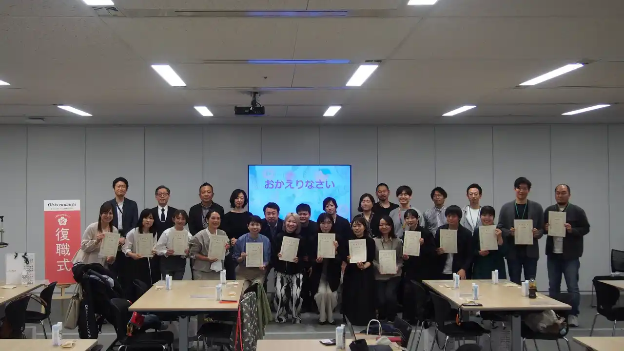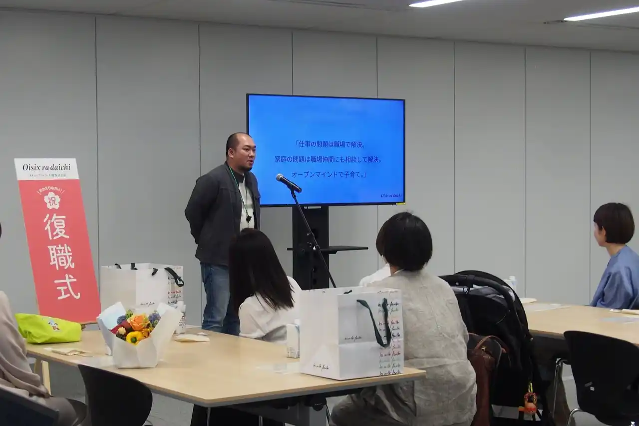 | 食品のサブスクリプションサービスを提供するオイシックス・ラ・大地株式会社(本社:東京都品川区、代表取締役社長:高島 宏平、以下 当社)は、育児休業を終え復職する社員を対象に「復職式」を2026年4月24日(金)に実施しました。本取り組みは2017年から毎年実施しており、今回は10回目の節目を迎えました。今年は初めて2部構成で開催し、1部では復職証書の授与や、無理しがちな復職後に向けて、あえて“頑張らないこと”を発表する【これは「頑張りま宣言」】などを実施したほか、2部では復職後の心理的負担軽減をテーマに、専門家と当社社員によるトークセッションを行いました。 | ||||||||||||||||