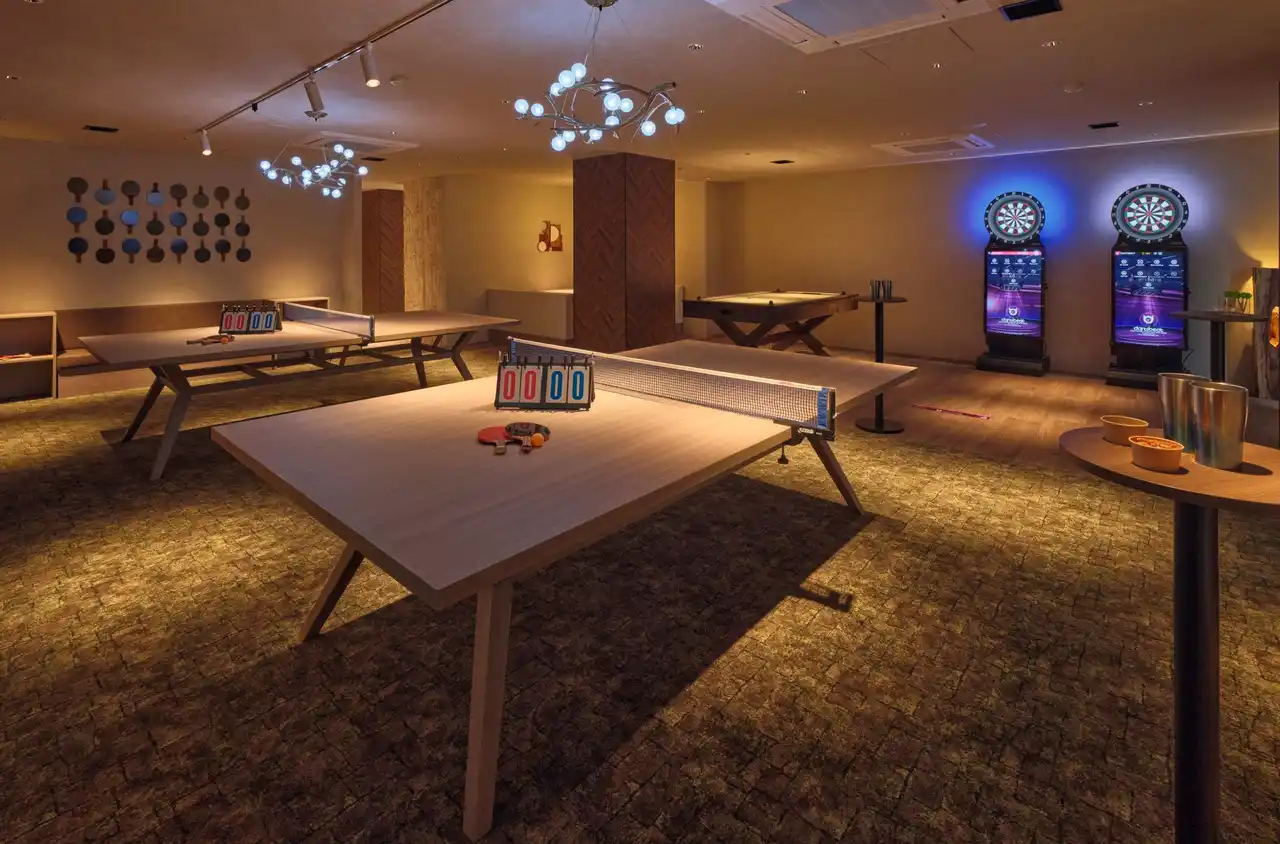 宿泊者専用のラウンジでは、ビリヤード、卓球、エアホッケーなどの娯楽コンテンツに加えて2,300冊の漫画や卓上ゲームなどを備えております。フリーフローでのドリンクを片手に、リラックスしながら過ごすハンモックルームなどもご用意しております。 |
