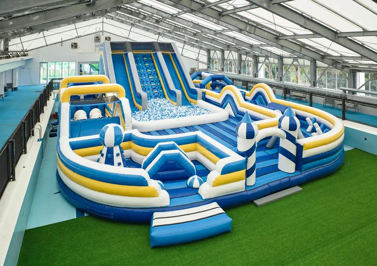 全長20m×15mの大型エアアスレチックス。高さ5.4mの滑り台を中心に、周回60mのコースには15種類の仕掛け。 |