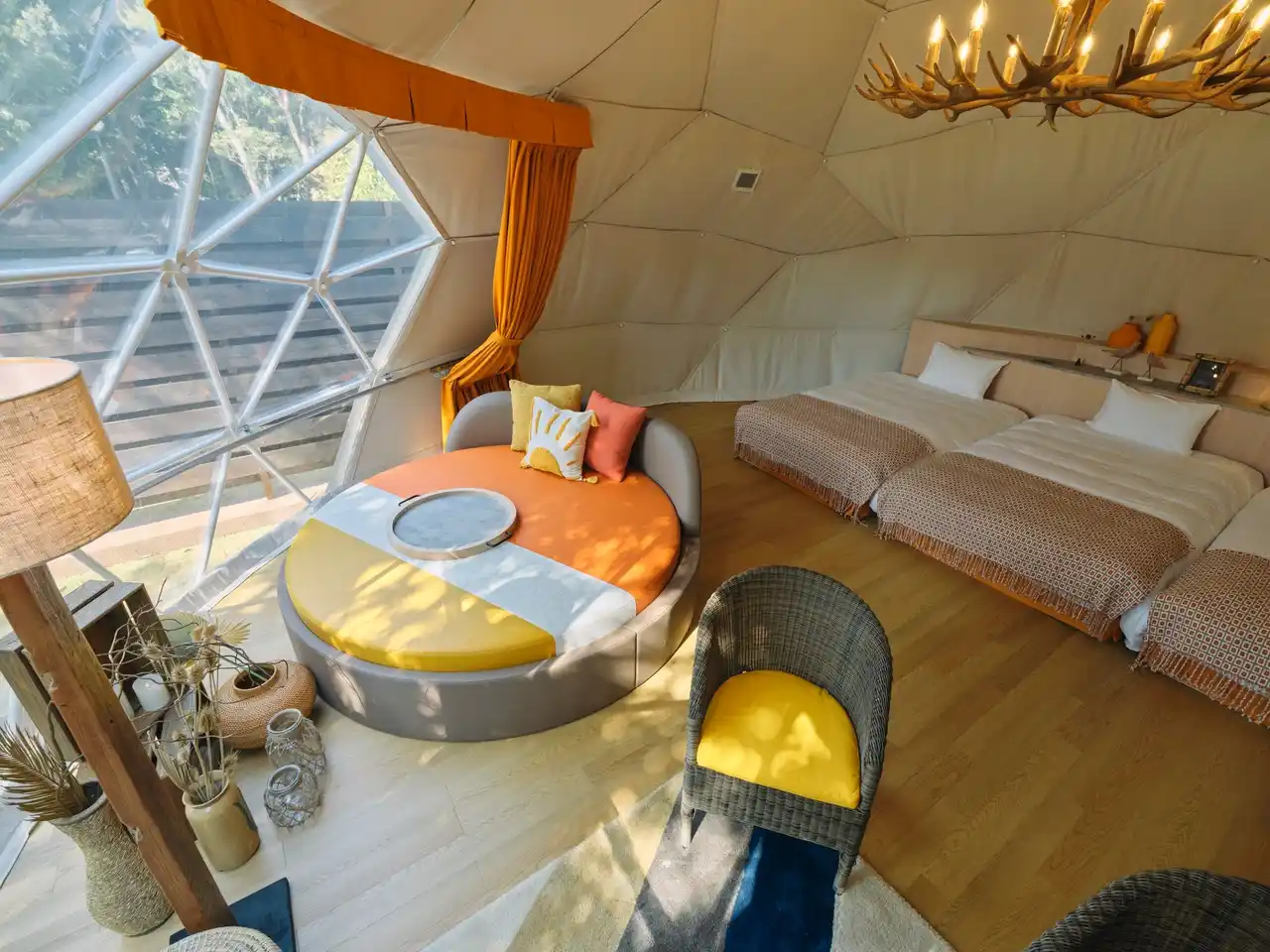 全32サイトのドームテントには3つのベッドにリビングスペース。各サイトにお化粧室、洗面所、BBQが楽しめるダイニングスペースがあり、快適なグランピングをお楽しみいただけます。まるで伊豆の自然に囲まれた空間で、森と一体になる滞在をお楽しみください(定員4名様) |