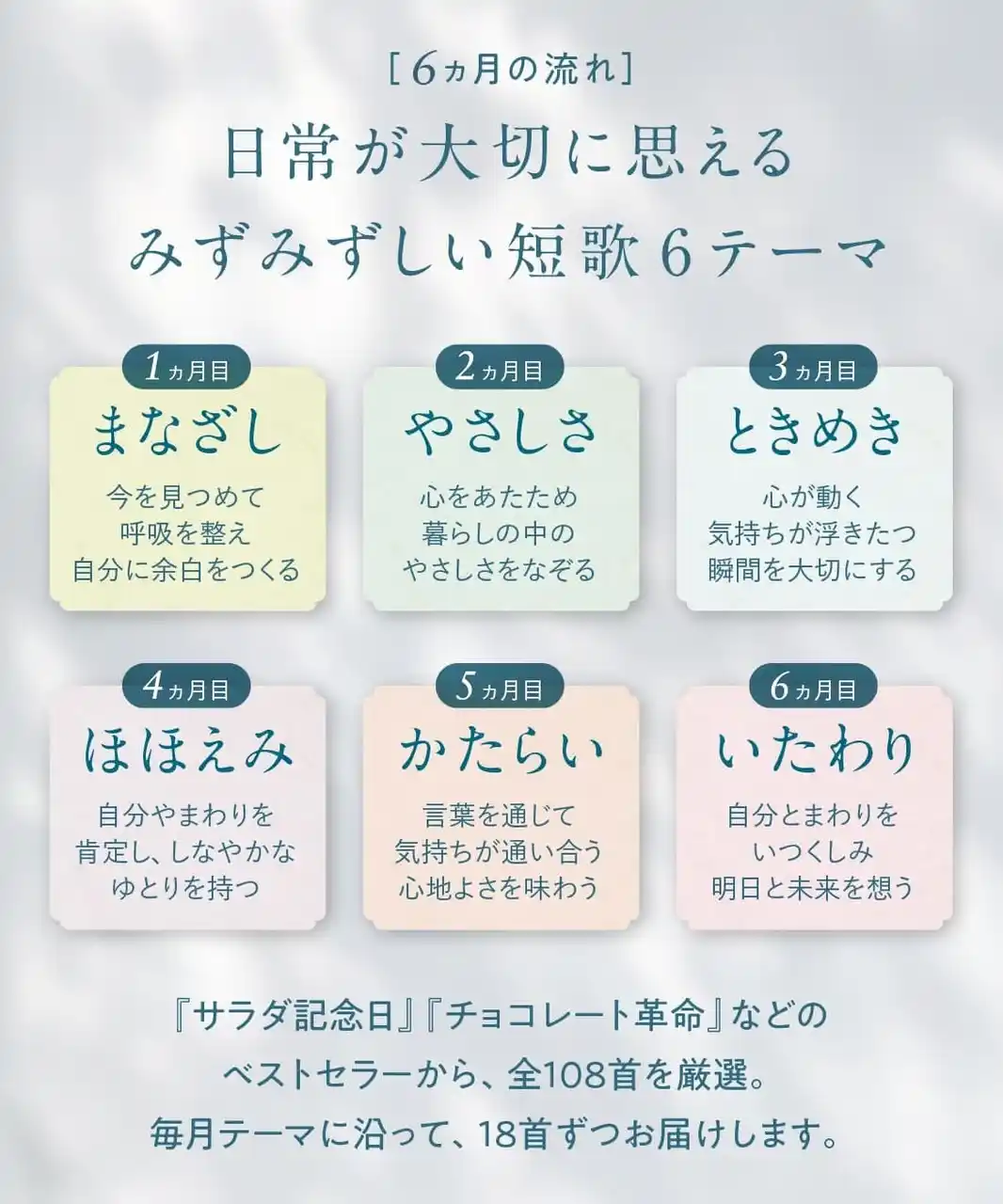 日常が大切に思えるみずみずしい短歌6テーマにわかれています。『サラダ記念日』『チョコレート革命』などのベストセラーから、全108首を厳選。毎月、テーマに沿って18首ずつ届きます。 |