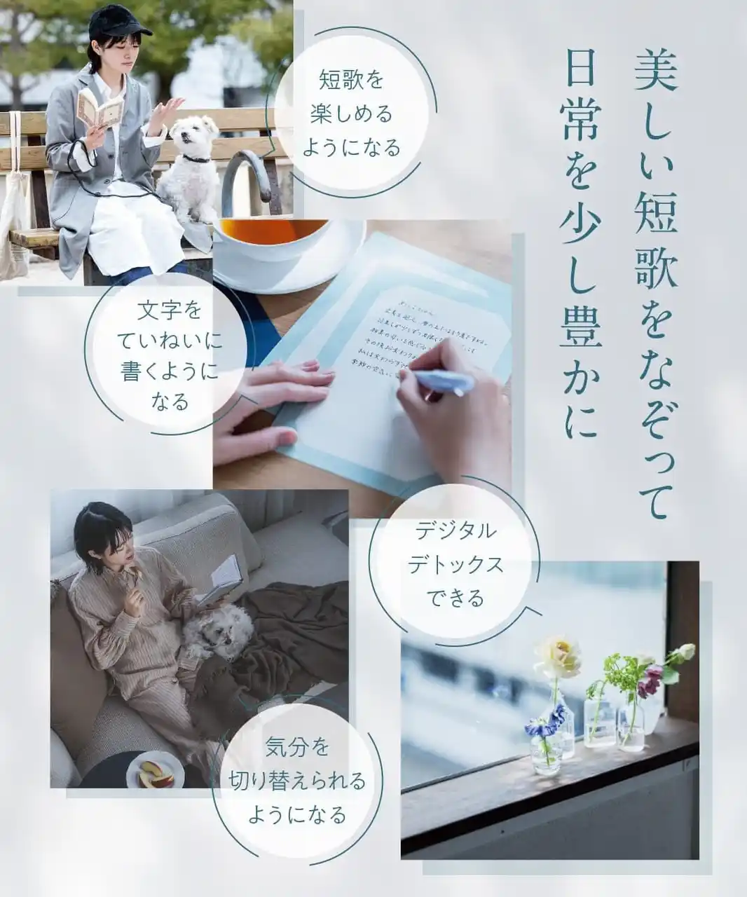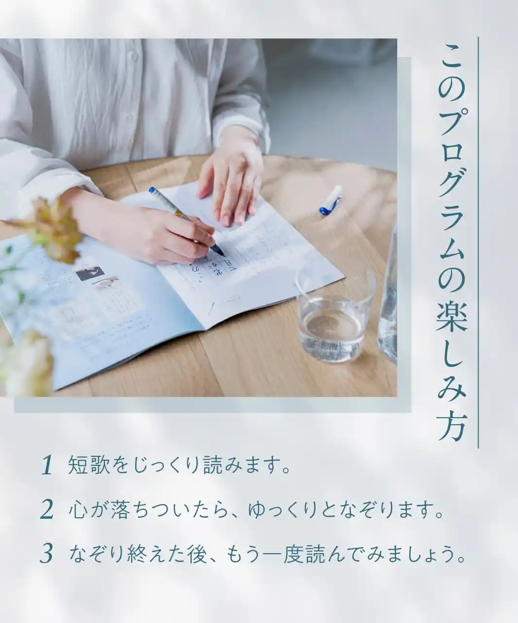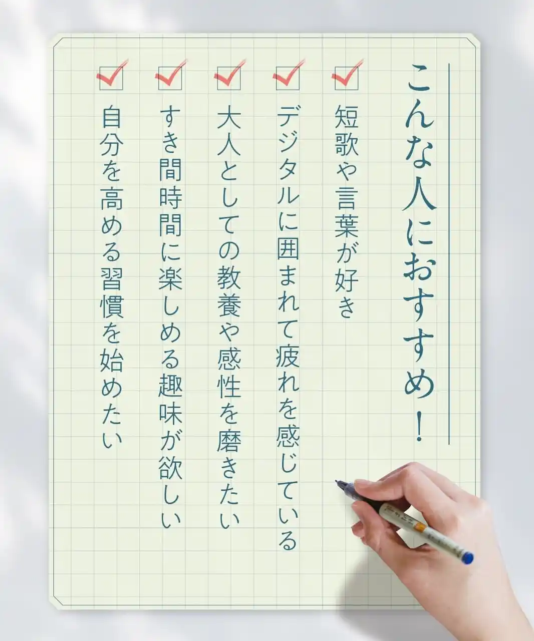 五・七・五・七・七の心地よいリズムを体感し、短歌を身近に楽しめるように。 【文字をていねいに書くようになる】 日々のなぞり書きの習慣がつくことで、きれいな文字を書くことを意識するように。 【デジタルデトックスできる】 電子機器を離れ、身の回りのさりげないことに気づく感性が磨かれるように。 【気分を切り替えられるようになる】