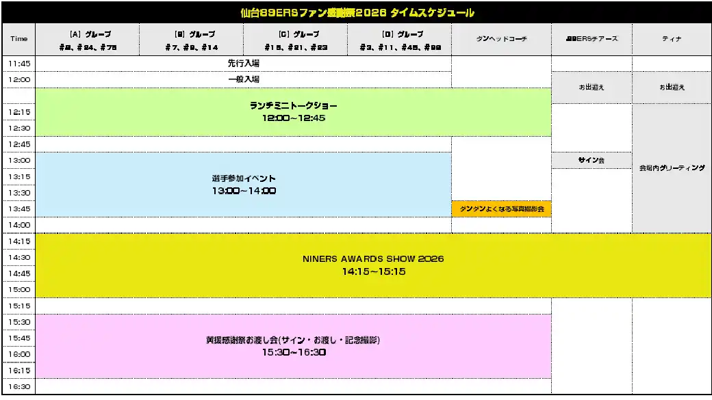 11:45 ランチミニトークショー付きチケットご購入者様 先行入場 12:00 一般入場 ランチミニトークショー スタート 13:00 選手参加イベント スタート 89ERSチアーズ オリジナルフォトブック サイン会&お渡し会 13:45 ダンダンよくなる写真撮影会 スタート 14:15 NINERS AWARDS SHOW 2026 スタート 15:15 NINERS AWARDS SHOW 2026 終了 15:30 黄援感謝祭お渡し会(サイン・お渡し・記念撮影) 16:30 終了予定 |