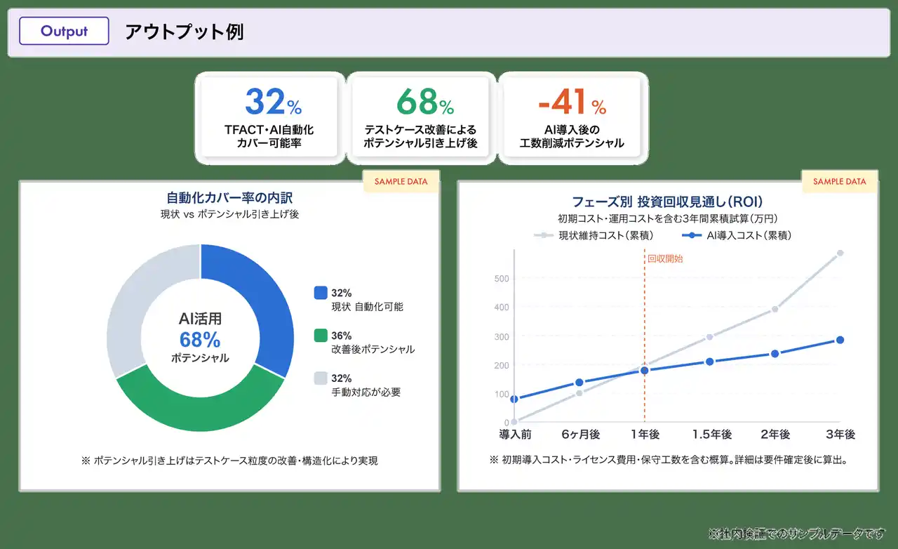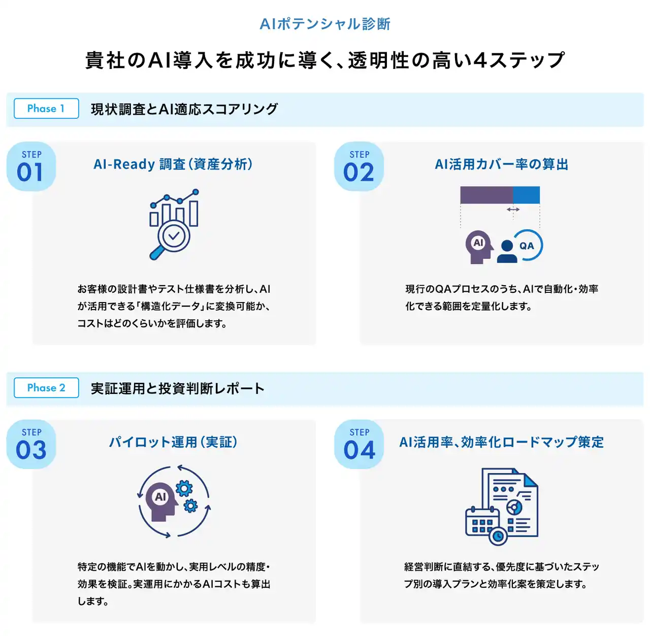 システムの特性やQAプロセスの違いにより、TFACT導入で「得られる効果の予測」は異なります。社内説明や導入判断の精度を高めたいお客様向けに、「AIポテンシャル診断サービス」をご用意しています。現状で「AIがどこまで活用可能か」の上限値を可視化し、「伸びしろ」をレポートにまとめてご提出いたします。 |