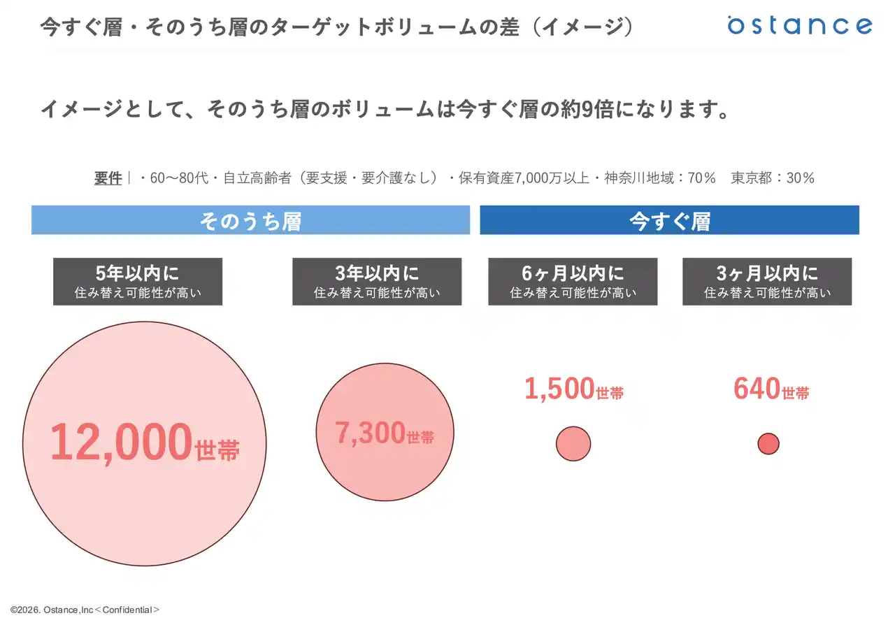 オースタンスは「5年以内に住み替えの可能性がある層」を約12,000世帯と推計。この「そのうち層」のボリュームは今すぐ層の約9倍に相当します。この大きな潜在層への早期接点化こそが、中長期的な成約最大化のカギと判断しました。 |