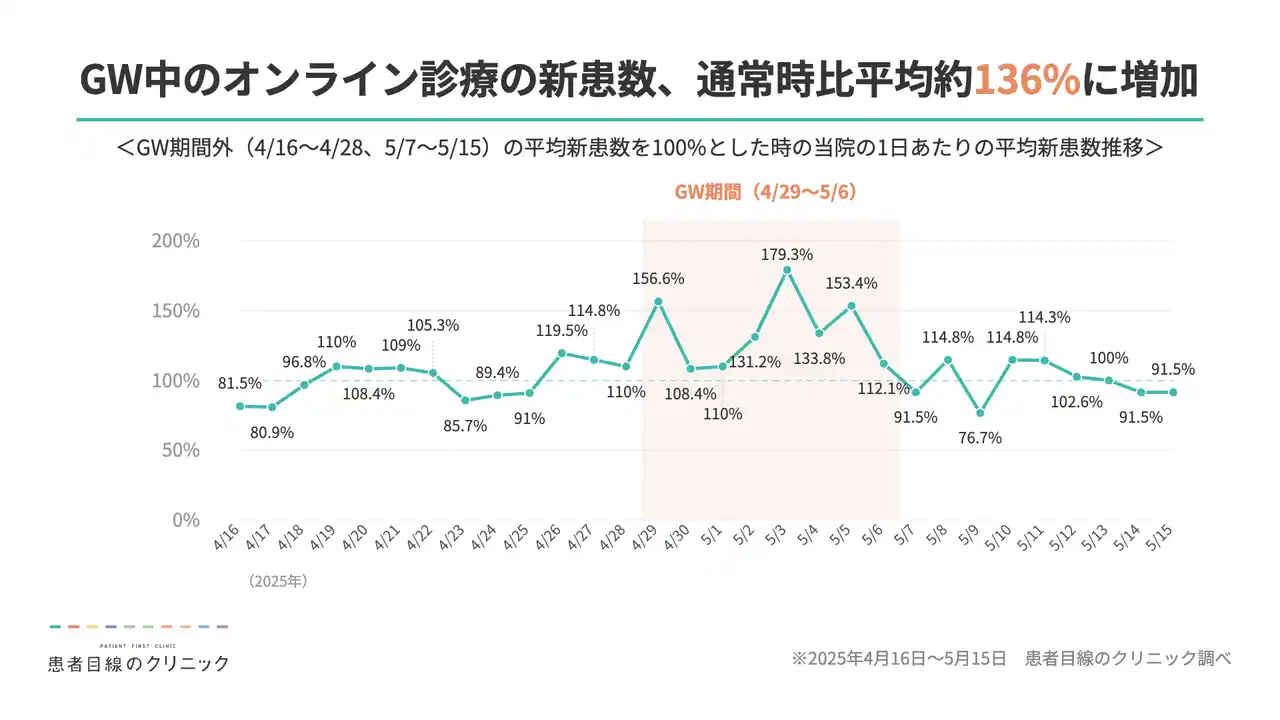昨年のゴールデンウィーク(GW)前後における当院の診療実績を分析したところ、1日あたりの平均新患数(※)において、GW期間中(4/29~5/6)は期間外に比べて平均約136%に増加していたことが判明しました。特に突発的な発熱等による内科受診の増加が目立ちます。連休中は普段とは異なる医療機関を探さざるを得ない「初診」の方の受け皿として、当院のようなオンライン診療の需要が高まった実態が浮き彫りとなりました。 |