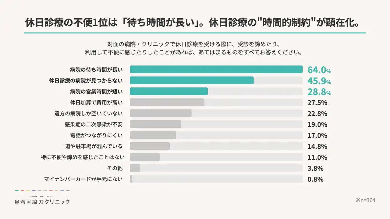 休日診療の不便1位は「待ち時間が長い」。休日診療の“時間的制約”が顕在化。 |