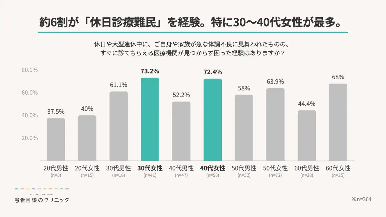 1.約6割の人が「休日診療難民」を経験。特に30~40代女性が最多。 |