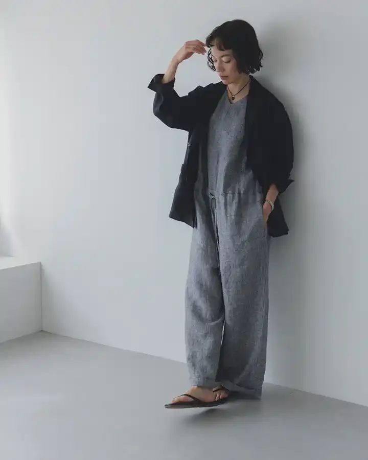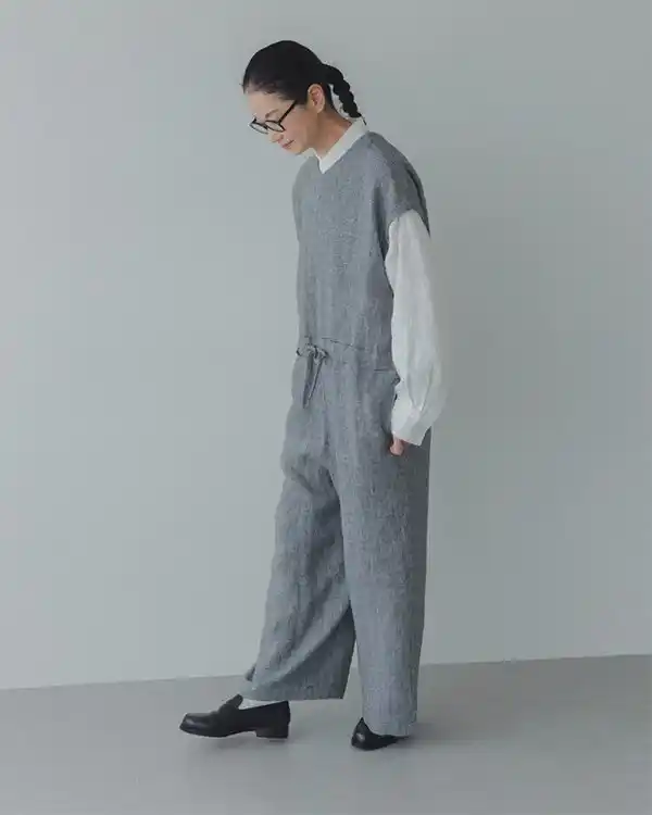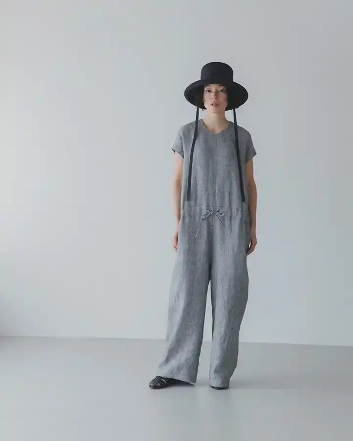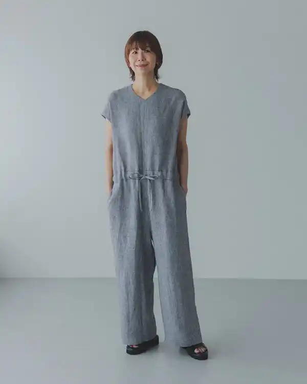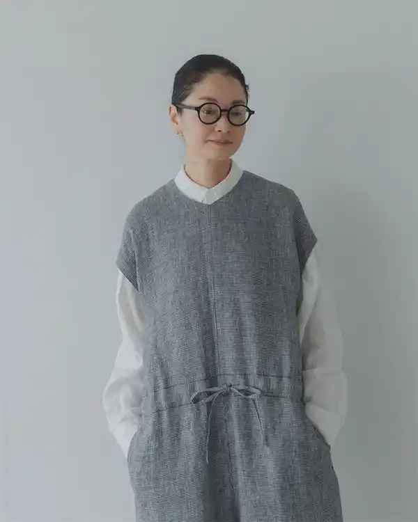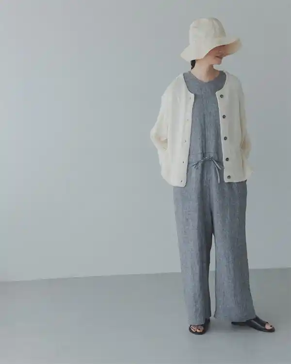 続いて、 北欧、暮らしの道具店 佐藤さんのコーデ。 佐藤さん「ご好評いただいた第一弾コラボアイテムのリネンジャケットにも合うような新たなアイテムを、かぐれさんとまた一緒に作りたかったので、今回このようにお届けできて嬉しいです。実は打ち合わせで、かぐれさんの店舗で新作を見せてもらった際に、オールインワンに一目惚れして購入し、実際とても使い勝手がよくて、昨年の夏はたくさん着回したんです。 そのオールインワンをヒントに、今回の第二弾コラボアイテム・千鳥柄のリネンオールインワンが生まれました」 |
