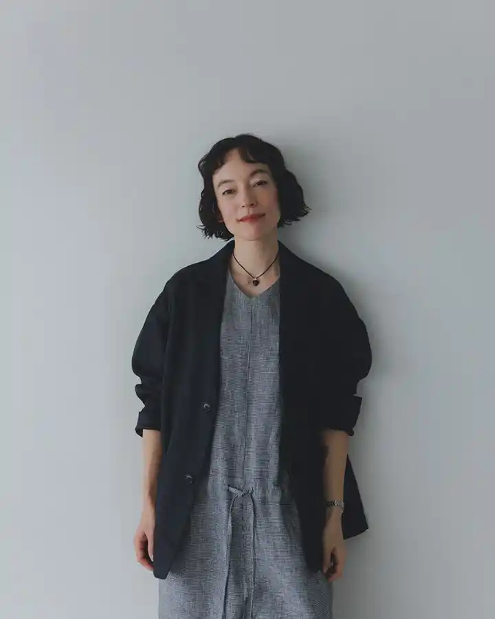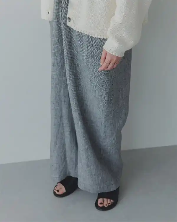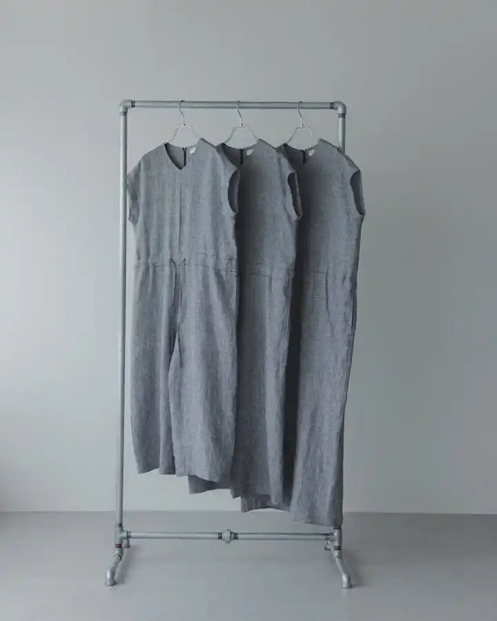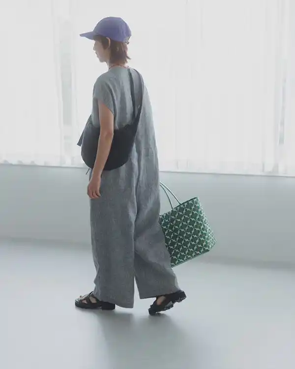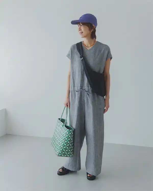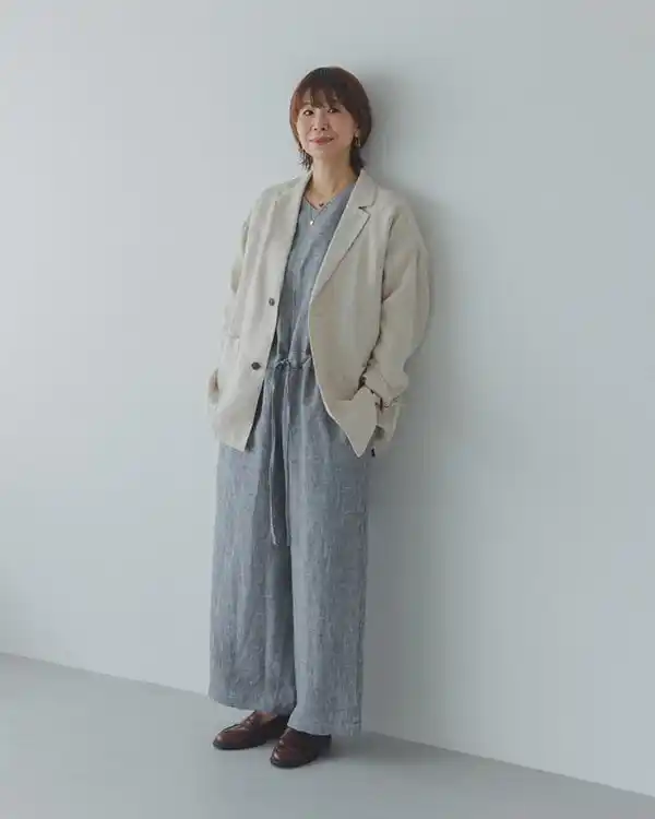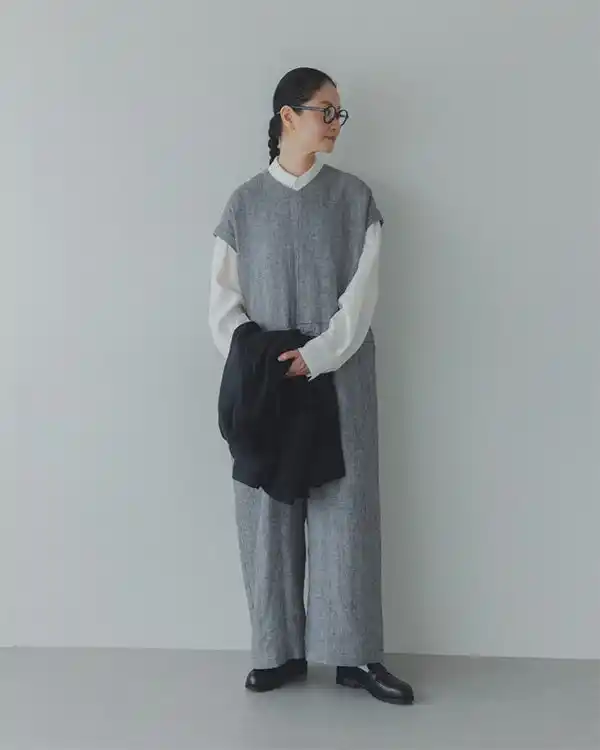 続いて、 北欧、暮らしの道具店 佐藤さんのコーデ。 佐藤さん「ご好評いただいた第一弾コラボアイテムのリネンジャケットにも合うような新たなアイテムを、かぐれさんとまた一緒に作りたかったので、今回このようにお届けできて嬉しいです。実は打ち合わせで、かぐれさんの店舗で新作を見せてもらった際に、オールインワンに一目惚れして購入し、実際とても使い勝手がよくて、昨年の夏はたくさん着回したんです。 そのオールインワンをヒントに、今回の第二弾コラボアイテム・千鳥柄のリネンオールインワンが生まれました」 |