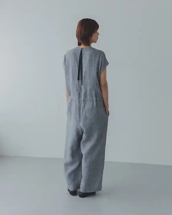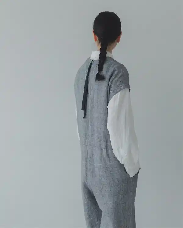 奥田 「このオールインワンは後ろのファスナーに、長めのリボンがついていて、着こなしのアクセントにもなりますし、ファスナーの上げ下げがしやすく脱ぎ着のストレスも軽減されています。 リネン100%のほどよい厚みの生地で、透け感も気にならず、さらにニュアンスのある千鳥柄なのでシワも気になりにくいのがいいなと思います」 北欧、暮らしの道具店 佐藤さん(160cm) Mサイズ着用 style 01. 一目惚れしたオールインワン。特別感のある一着になりました |