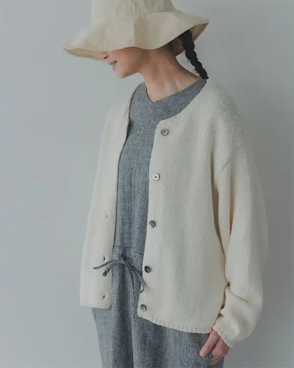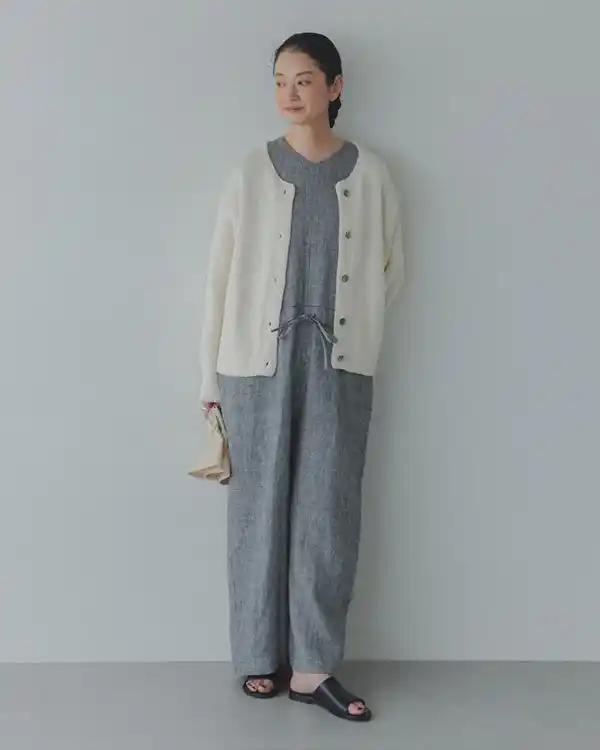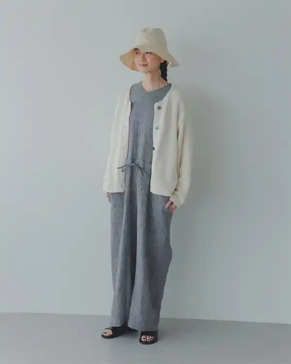 まずはこのコラボ企画にも開発から携わっている、奥田MDのコーデ。コラボアイテムの「千鳥柄のリネンオールインワン」に、アイボリーのカーディガン(かぐれ / コットンローゲージショートカーディガン)*とハット(私物)と合わせたコーディネートを。 |