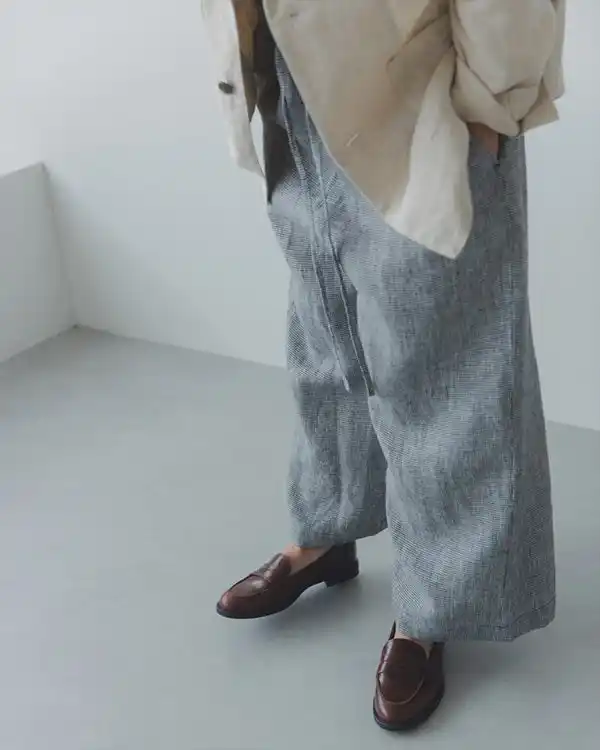 | 奥田 「レストランで食事をする場面をイメージして、きちんと感のアップする襟付きのリネンシャツ(かぐれ / リネンレギュラーボックスシャツ)とローファーを合わせました。この上にジャケットを羽織れば、よりシックな印象でまとめられると思います。 袖口がワイドなつくりなので、長袖シャツも下に重ねて着ることができます。夏場もあまり腕を出すのは避けたいので、重ね着しやすいのは助かります。シャツ以外にも、カットソーやTシャツを合わせても。ロングシーズンいろんな着回しを楽しめますよ」 | |||||||||