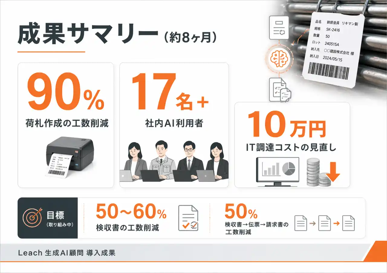 90% 荷札作成の工数削減 / 17名+ 社内AI利用者 / 10万円 IT調達コストの見直し |