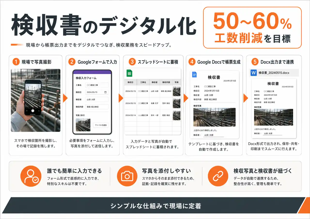 Google Form → スプレッドシート → Google Docs → Docx出力まで、すべてつながったフローを構築中です。目標として50~60%の工数削減を見込んでいます。 |