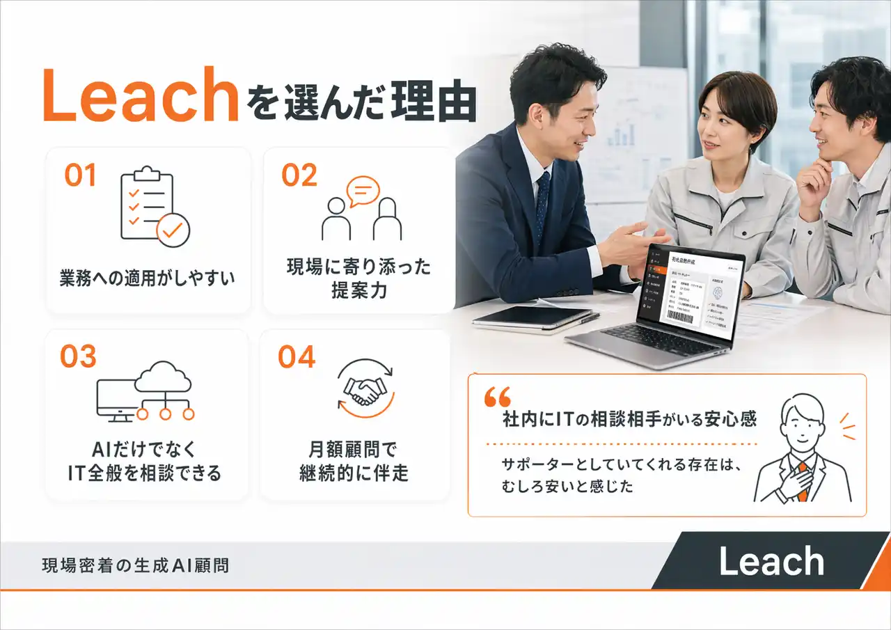 サービス名:Leach 生成AI顧問 利用開始:2025年7月23日(インタビュー時点で約8ヶ月利用中) |