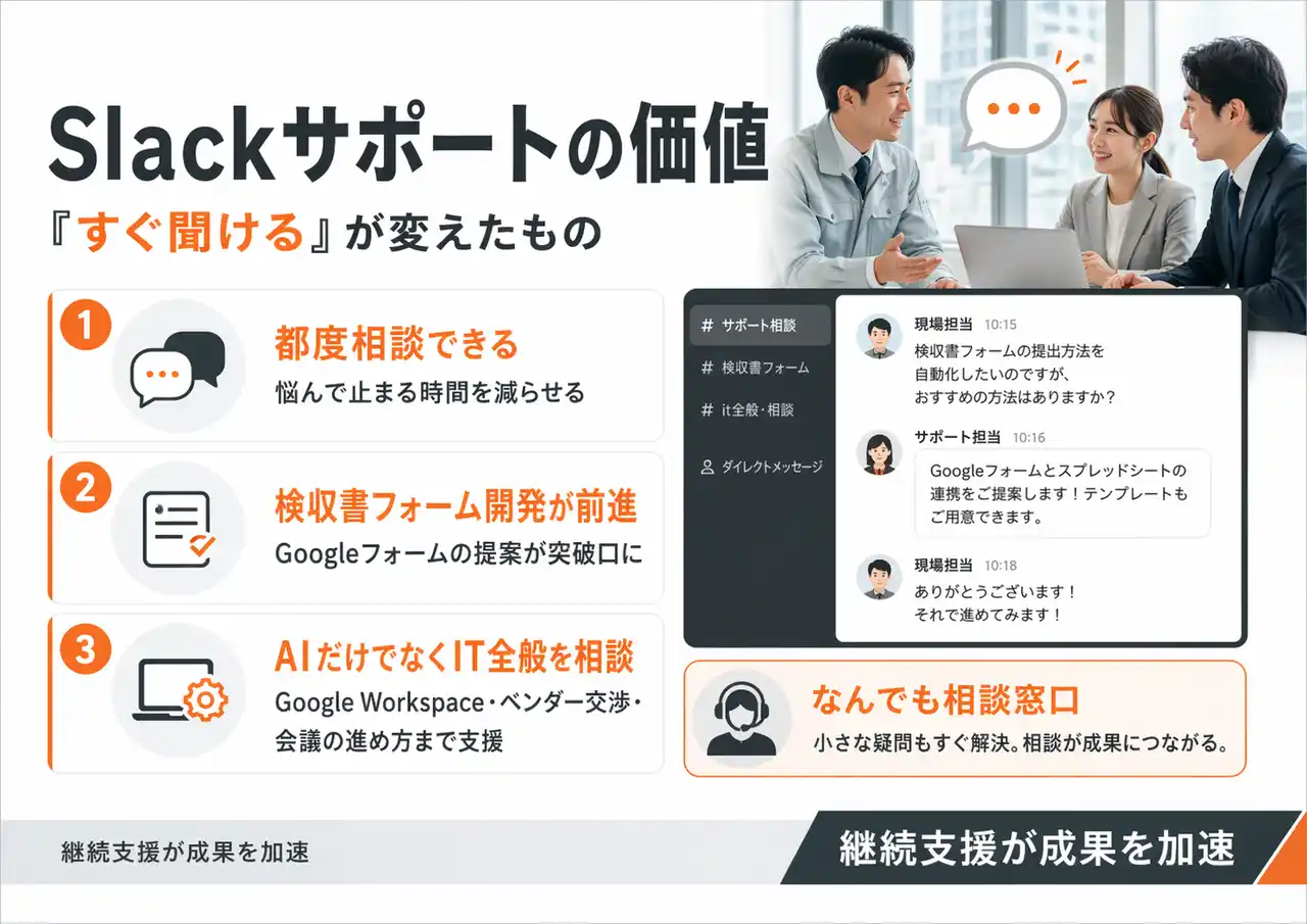西川様:都度相談しています。検収書の仕組みは、自分だけでやっていたら悩むだけで終わっていたと思います。Googleフォームの提案も、Slackで相談したからこそ出てきた発想でした。 |
