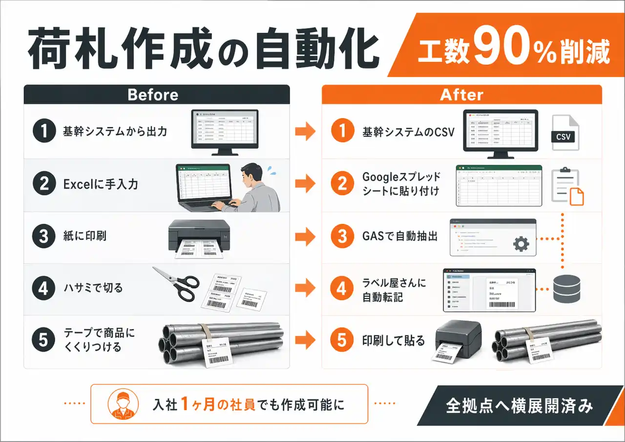 After 基幹システムのCSV → Googleスプレッドシートに貼り付け → GASで自動抽出 → ラベル屋さんに自動転記 → 印刷して貼る |