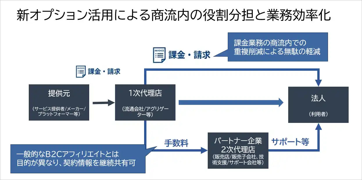 AIマネタイズにおいて、事業者間で発生するバケツリレー形式での従量課金の料金計算業務は大きな課題となっています。そこで、ビープラッツは、従量課金の業務の重複を解消し、本来の付加価値業務への集中を実現する新オプション「アフィリエイト機能」を本日より提供開始いたします。本機能を活用いただくことで、顧客に対する課金業務を担う役割の企業と、顧客向けに技術提供や付加価値サポート等の業務に特化する顧客対面の企業との役割を分離することが可能となります。 |