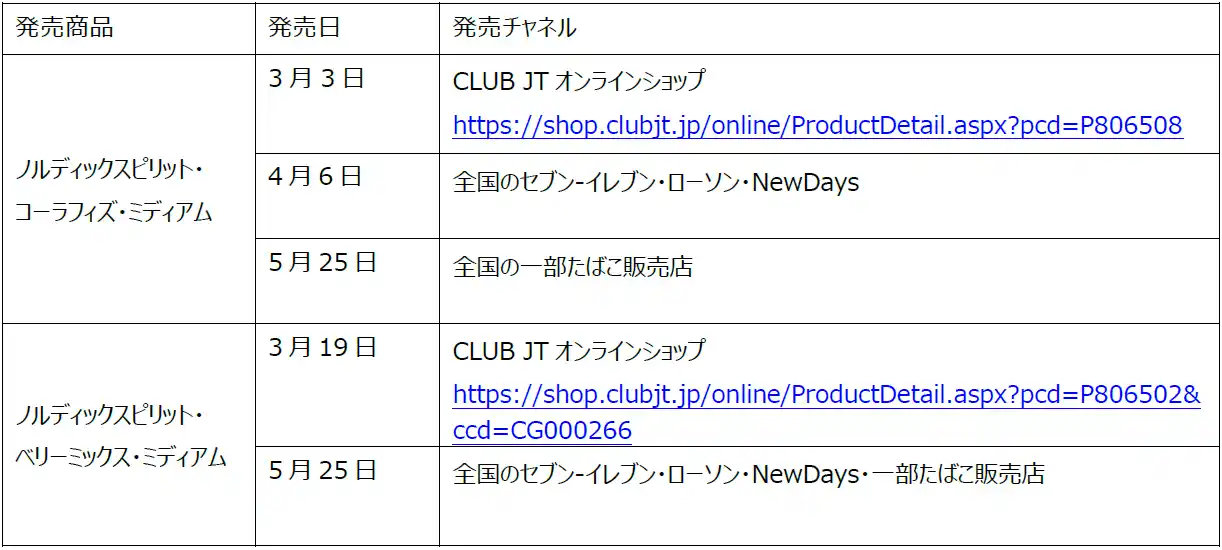 JTは、リフレッシュパウチ「ノルディックスピリット」より、「ベリーミックス・ミディアム」を2026年5月25日より、全国のセブン-イレブン・ローソン・NewDaysおよび一部たばこ販売店にて順次販売を開始します。あわせて、「コーラフィズ・ミディアム」についても、5月25日より全国の一部たばこ販売店での取り扱いを開始します。 |