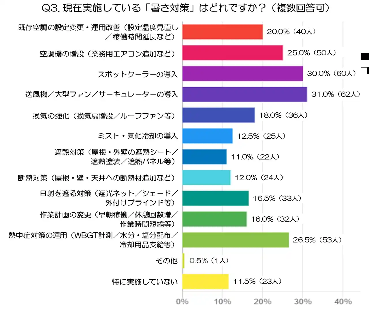 次いで「スポットクーラーの導入」30.0%(60人)、「熱中症対策の運用(WBGT計測/水分・塩分配布/冷却用品支給等)」26.5%(53人)、「空調機の増設(業務用エアコン追加など)」25.0%(50人)が続きました。設備面の強化に加え、体調管理や安全対策を組み合わせながら対応している現場が多いことが分かります。 |